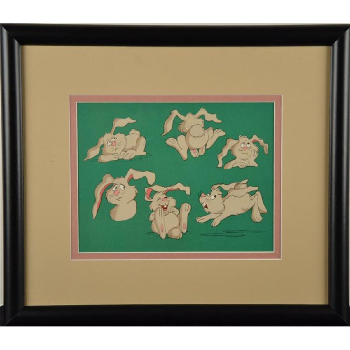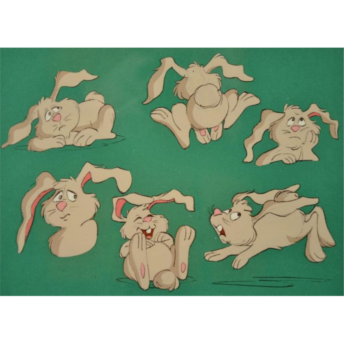 This is an original model cel of a rabbit, used in an animated feature. The cel portrays 6 different poses of the floppy eared bunny, looking very cute. * Medium: Hand-painted cel acetate over green backgroundImage size: 8 x 10 1/2 inchesFraming: Double matted in tan and pink, in matte black laminate wood frame Frame size: 16 1/4 x 18 3/4 inchesCondition: ExcellentCertificate of Authenticity: Included