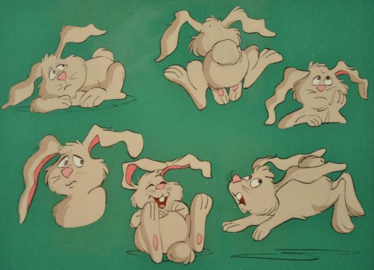 This is an original model cel of a rabbit, used in an animated feature. The cel portrays 6 different poses of the floppy eared bunny, looking very cute. * Medium: Hand-painted cel acetate over green backgroundImage size: 8 x 10 1/2 inchesFraming: Double matted in tan and pink, in matte black laminate wood frame Frame size: 16 1/4 x 18 3/4 inchesCondition: ExcellentCertificate of Authenticity: Included