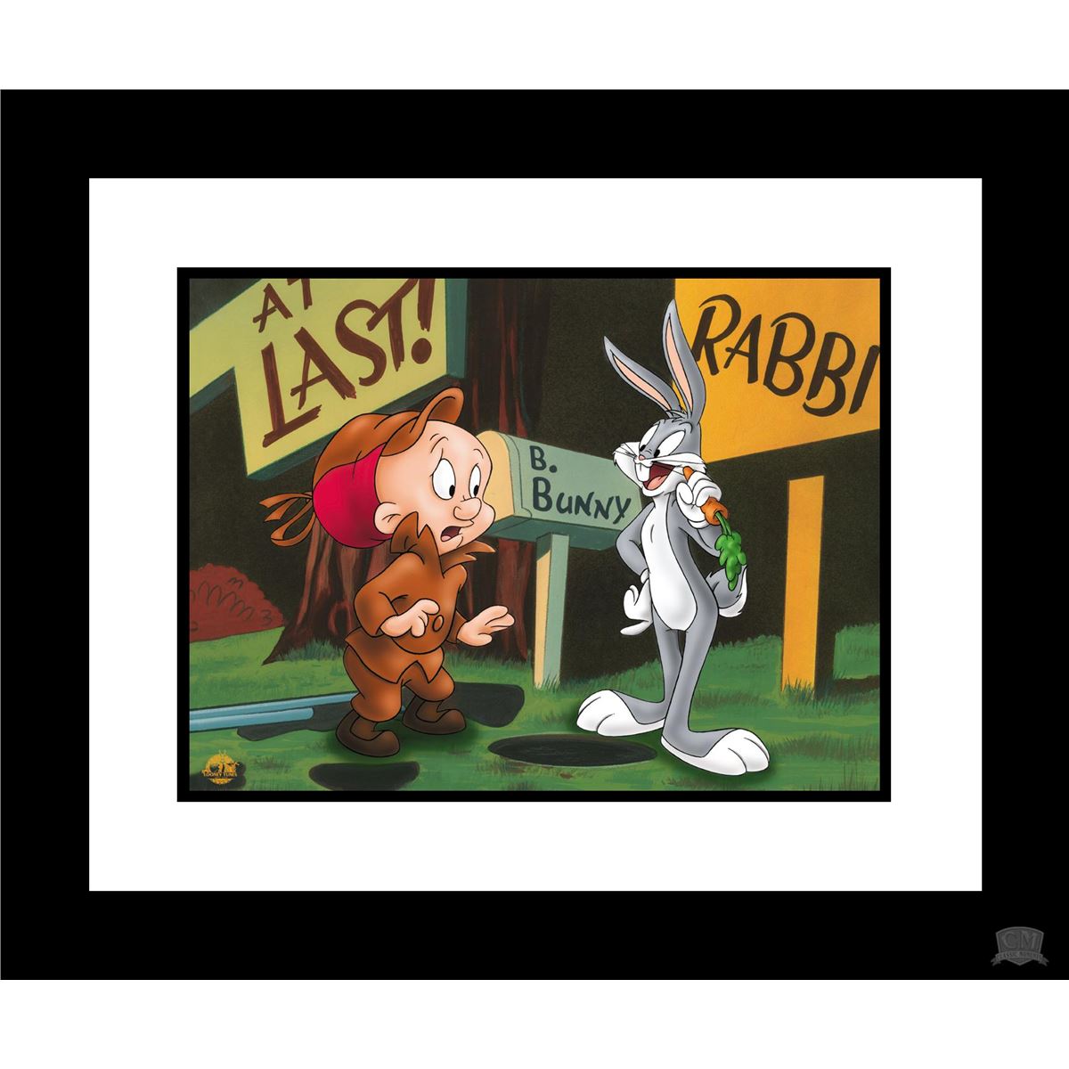 This framed limited edition 16x20 giclee is entitled “Rabbit Seasoning.†Rabbit Seasoning is a 1952 Merrie Melodies cartoon, directed by Chuck Jones. The cartoon finds a row of signs saying it's rabbit season ("If you're looking for fun, you don't need a