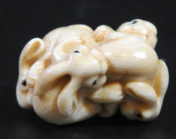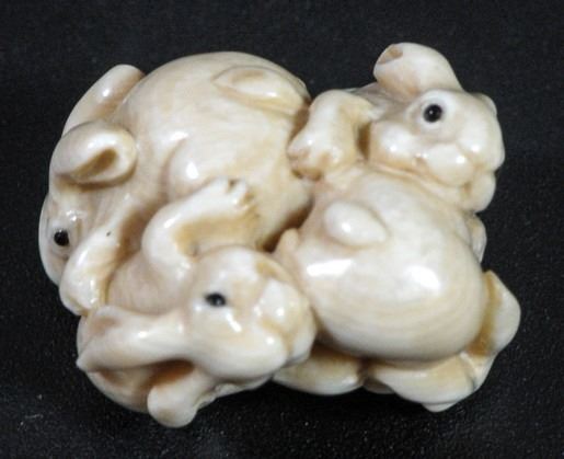 Rabbit family, ivory netsuke, signed, length: 2.5 cm.