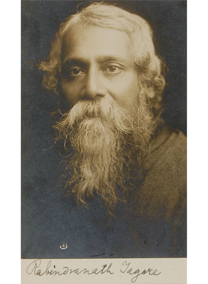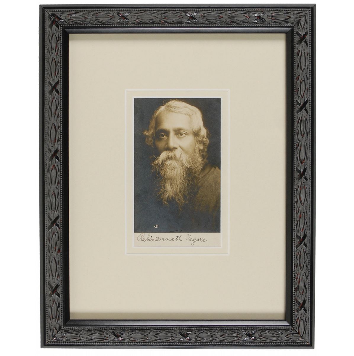 Bengali poet, playwright, philosopher, and author (1861–1941) who became the first non-European to win a Nobel Prize (Literature) in 1913. Exceptional matte-finish 3 x 5 photo of Tagore in a well-known head-and-shoulders pose, signed in the lower border in fountain pen. Double-matted and framed to an overall size of 9.5 x 12. In fine condition, with moderate silvering to dark areas of the image (mainly visible from an angle). A supremely appealing signed photograph of this world-renowned literary figure.