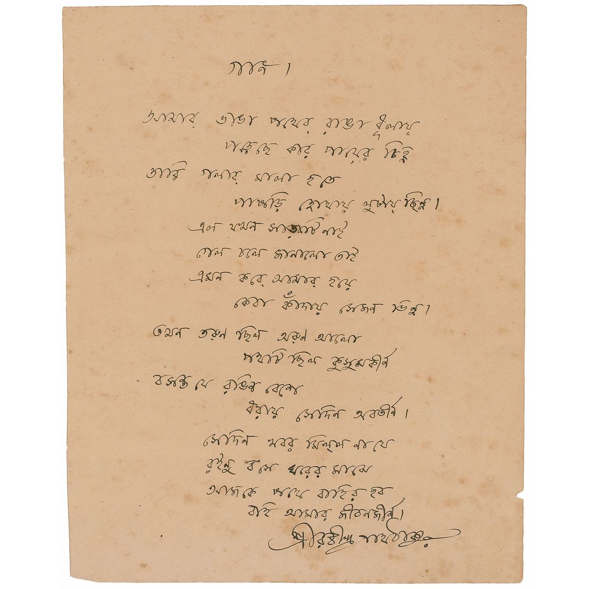 Untranslated, eloquently-penned handwritten lyrics, in Bengali to ‘Amar Shonar Bhanga’ (My Golden Bengal) on an off-white 7.5 x 9.5 sheet, signed at the conclusion by Tagore. In very good condition, with uniform toning, scattered spotting and foxing, trimmed edges, and clipped corners. The song was written by Tagore in 1905 to rekindle the unified spirit of Bengal, to raise public consciousness against the communal political divide. In 1972, the first ten lines of ‘Amar Shonar Bhanga’ were adopted as the Bangladeshi national anthem.