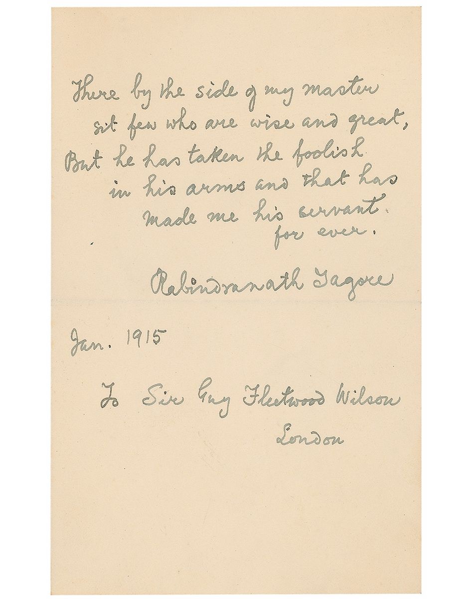 Beneath the date, Tagore inscribes “To Sir Guy Fleetwood Wilson, London.” Wilson was a member of the British Viceroy’s Council in India at the time. In fine condition.