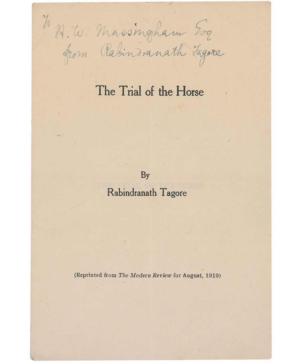 Bengali poet, playwright, philosopher, and author (1861–1941) who became the first non-European to win a Nobel Prize (Literature) in 1913. A printed booklet of Tagore’s short story The Trial of the Horse, 4.75 x 7, seven pages, signed and inscribed on the front cover, “To H. W. Massingham Esq., from Rabindranath Tagore.” In fine condition, with a central vertical fold and some mild handling wear.