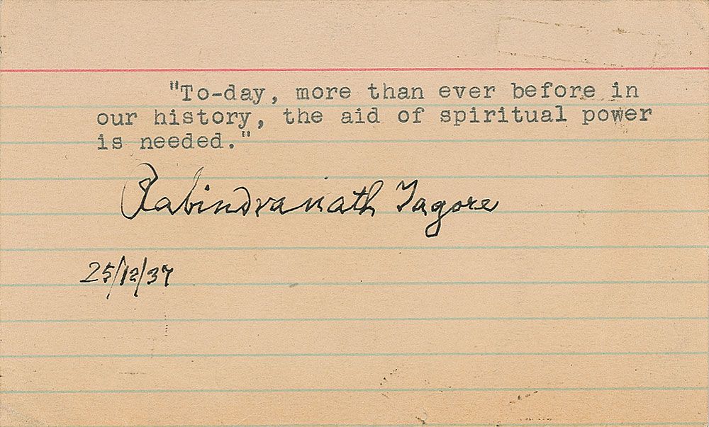 TQS on an off-white 5 x 3 lightly-lined card. Quote reads, “To-day, more than ever before in our history, the aid of spiritual power is needed.” Signed underneath in black ink, “Rabindranath Tagore 25/12/37.” In very good condition, with uniform toning, a