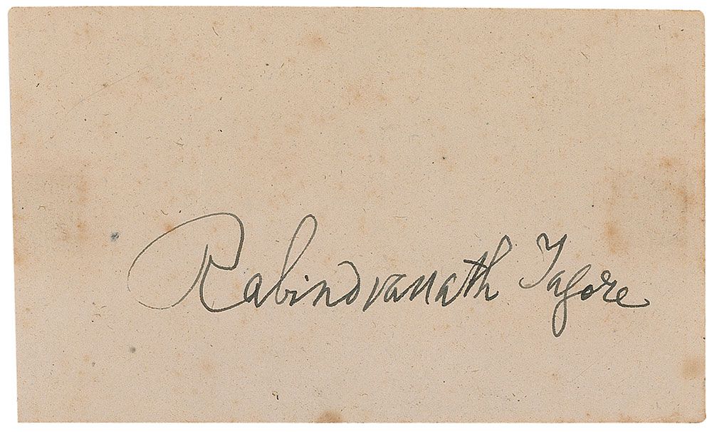 Bengali poet, playwright, philosopher, and author (1861–1941) who became the first non-European to win a Nobel Prize (Literature) in 1913. Vintage ink signature, “Rabindranath Tagore,” on an off-white 5 x 3 slip. Scattered light toning and soiling and a few tape remnants to reverse, otherwise fine condition.