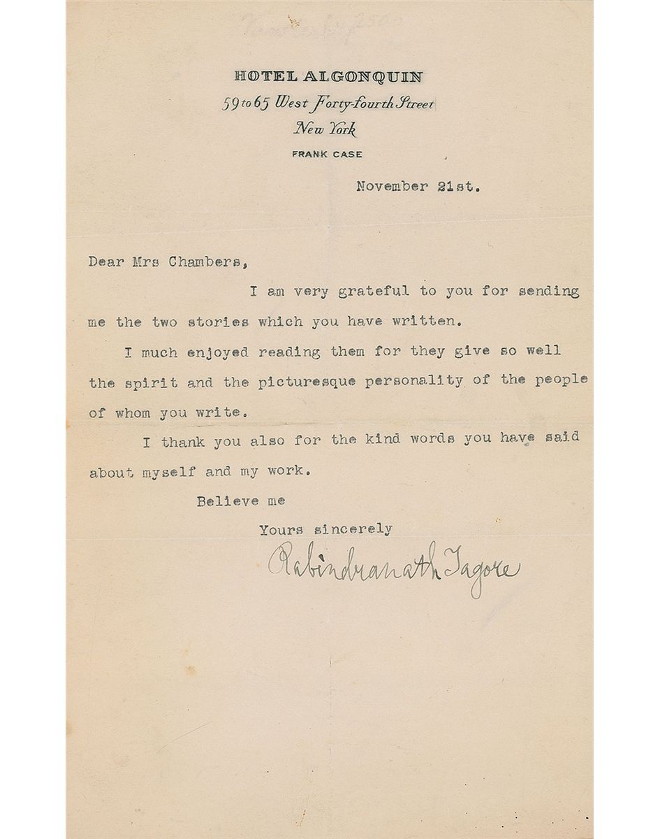 Bengali poet, playwright, philosopher, and author (1861–1941) who became the first non-European to win a Nobel Prize (Literature) in 1913. ALS, one page, 6 x 9.25, Hotel Algonquin letterhead, November 21, no year. Letter to an admirer and aspiring writer. In full: “I am very grateful to you for sending me the two stories which you have written. I much enjoyed reading them for they give so well the spirit and the picturesque personality of the people of whom you write. I thank you also for the kind words you have said about myself and my work.” In fine condition, with intersecting folds (one fold passing through a single letter of his first name) and light overall wrinkling.