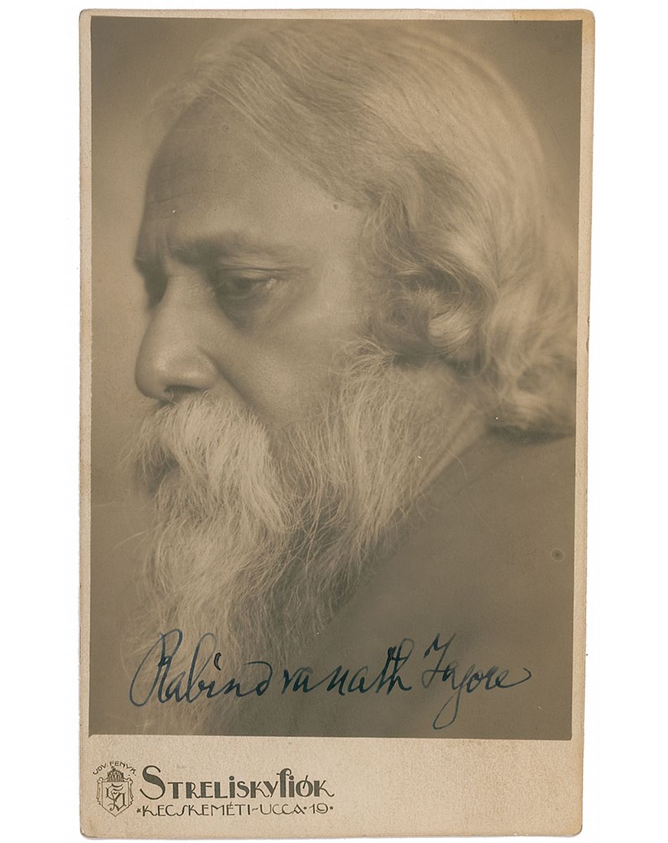 Bengali poet, playwright, philosopher, and author (1861–1941) who became the first non-European to win a Nobel Prize (Literature) in 1913. Vintage 3.25 x 5.25 German postcard close-up photo, signed in fountain pen. In fine condition.