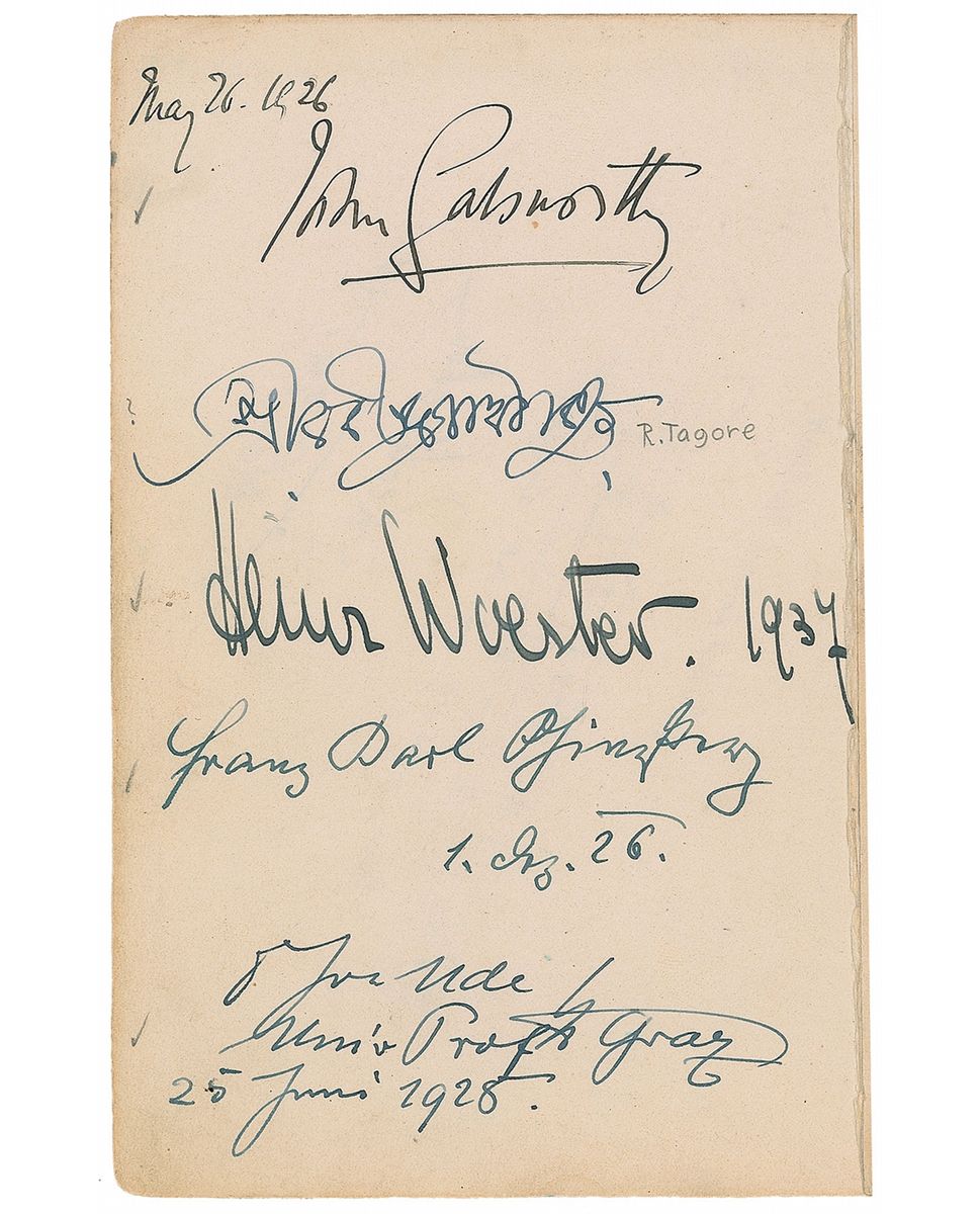 Bengali poet, playwright, philosopher, and author (1861–1941) who became the first non-European to win a Nobel Prize (Literature) in 1913. Ink signature, in Bengali, on an off-white 4.5 x 6.75 album page, with an identical size adjoining page. Pages are also signed by John Galsworthy; Swiss film actor Heinz Woester; Austrian General Victor von Dankl, who adds, “In memory of our first victories”; French writer Tristan Bernard, who adds, “Souvenir of a much too short stay in Vienna”; Prince Ulrich Kinsky; Emma Gramatica; and Leo Ascher, who adds a four-bar AMQS of his most famous work, ‘His Highness Dances a Waltz.’ In fine condition, with light edge toning and pencil notations near some of the signatures.