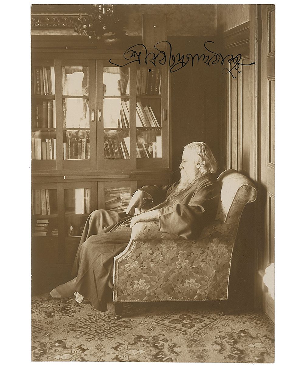 Bengali poet, playwright, philosopher, and author (1861–1941) who became the first non-European to win a Nobel Prize (Literature) in 1913. Vintage 3.75 x 5.5 postcard photo of Tagore sitting in a chair in front of a packed bookcase, signed across the top in fountain pen, in Bengali. In fine condition.