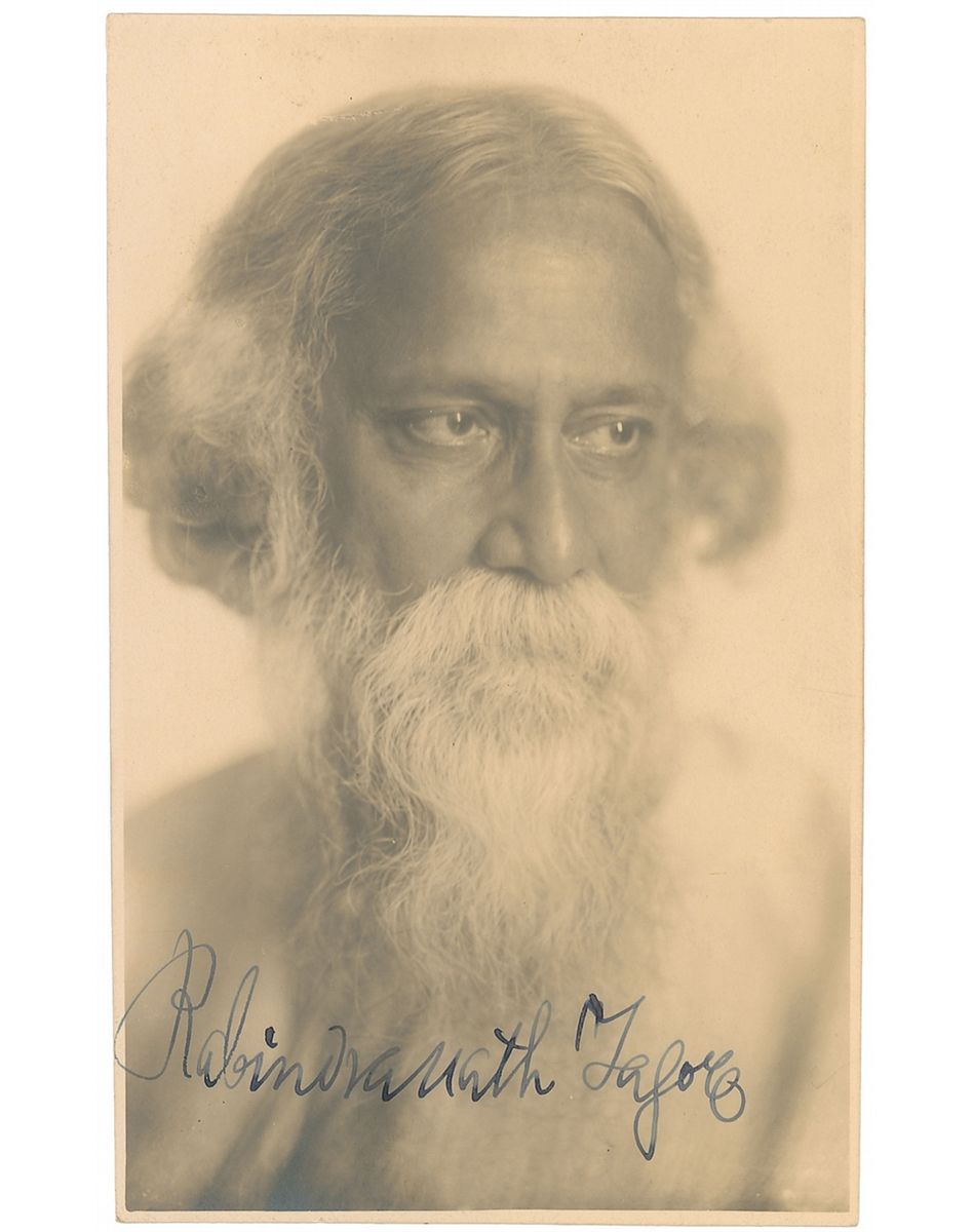 Bengali poet, playwright, philosopher, and author (1861–1941) who became the first non-European to win a Nobel Prize (Literature) in 1913. Spectacular matte-finish 3.25 x 5.25 postcard photo of Tagore in a formal pose, signed at the bottom in fountain pen. Subtly blindstamped at the bottom by a photography studio. In fine condition. A positively exquisite portrait of the revered writer with a choice signature.