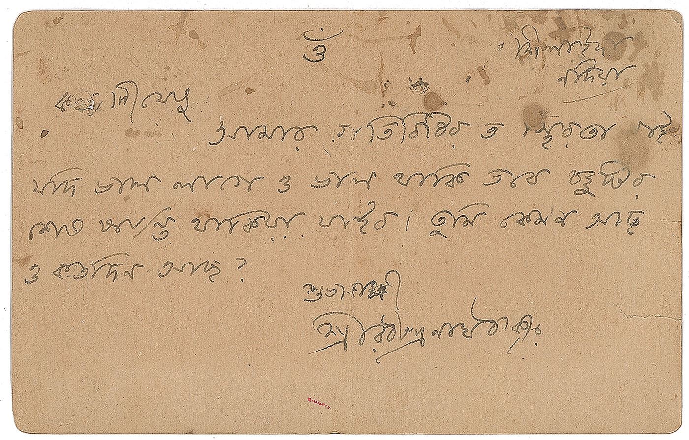 Bengali poet, playwright, philosopher, and author (1861–1941) who became the first non-European to win a Nobel Prize (Literature) in 1913. Rare ALS in Bengali, one page on the reverse of a 5.5 x 3.5 postal card, postmarked October 18, 1900. Letter to Bengali poet and editor Jatindramohan Bagchi, in full: "Blessed, There is no surety of my movements. If I feel good and I am physically fit then I shall stay till the end of my holidays and then go. How are you doing and how long will you be there." In very good condition, with a central vertical fold, a small hole in the stamp, a tear to the right edge, and scattered staining.