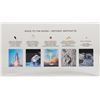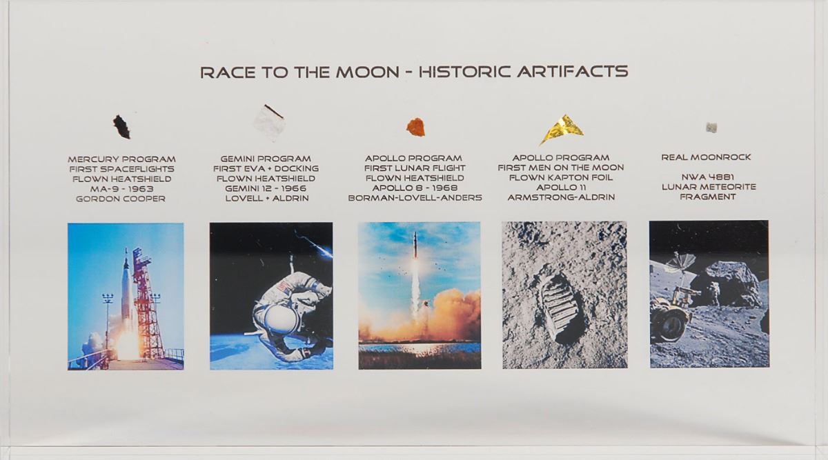 Acrylic display containing flown artifacts from all major steps of NASA’s ‘race to the moon,’ measuring 7 x 4 x 1, with each swatch identified below. Flown artifacts are heat shield from Mercury-Atlas 9, heat shield from Gemini 12, heat shield from Apollo 8, and Kapton foil from Apollo 11. Also included in the display is a fragment of ‘real moonrock’ from lunar meteorite NWA 4881. In fine condition. Accompanied by a certificate of authenticity from Spaceflori, stating that this acrylic display is number 21 of 25 produced.