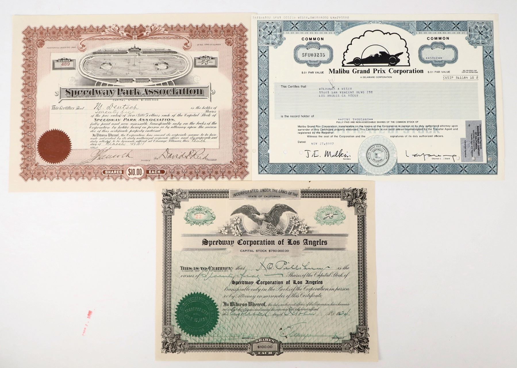Lot of 3 different. 1) Speedway Corporation of Los Angeles. 1924. 2) Speedway Park Association, Chicago, 1915, racetrack vignette. 3) Malibu Grand Prix Corporation. 1987. Race car vignette.