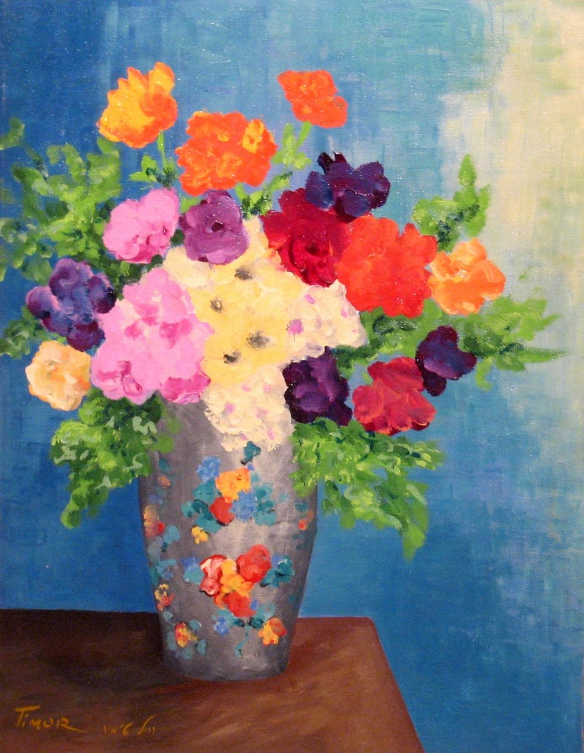 Rachel Timor, Israeli Art, B. 1944, Vase with Flowers, Oil on canvas mounted on cardboard, 45x35cm, Signed., , , , ,