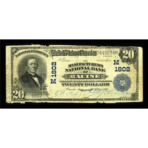 <B>Racine, WI </B></I>- $20 1902 Plain Back Fr. 653 <B>The Manufacturers NB</B></I> Ch. # (M)1802<B></B></I><BR> This scarce Racine bank issued large notes only, with the census standing at just fourteen pieces. Surprisingly, only two of that number as 1902 Plain Backs, with this example, which is new to the census, the only $20 reported. <B>Fine</B></I> or a bit better. <BR><BR><b>Shipping:</b> Coins & Currency (<a target="_blank" href="http://www.heritageauctions.com/common/shipping.php">view shipping information</a>)