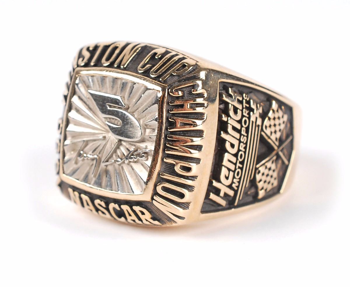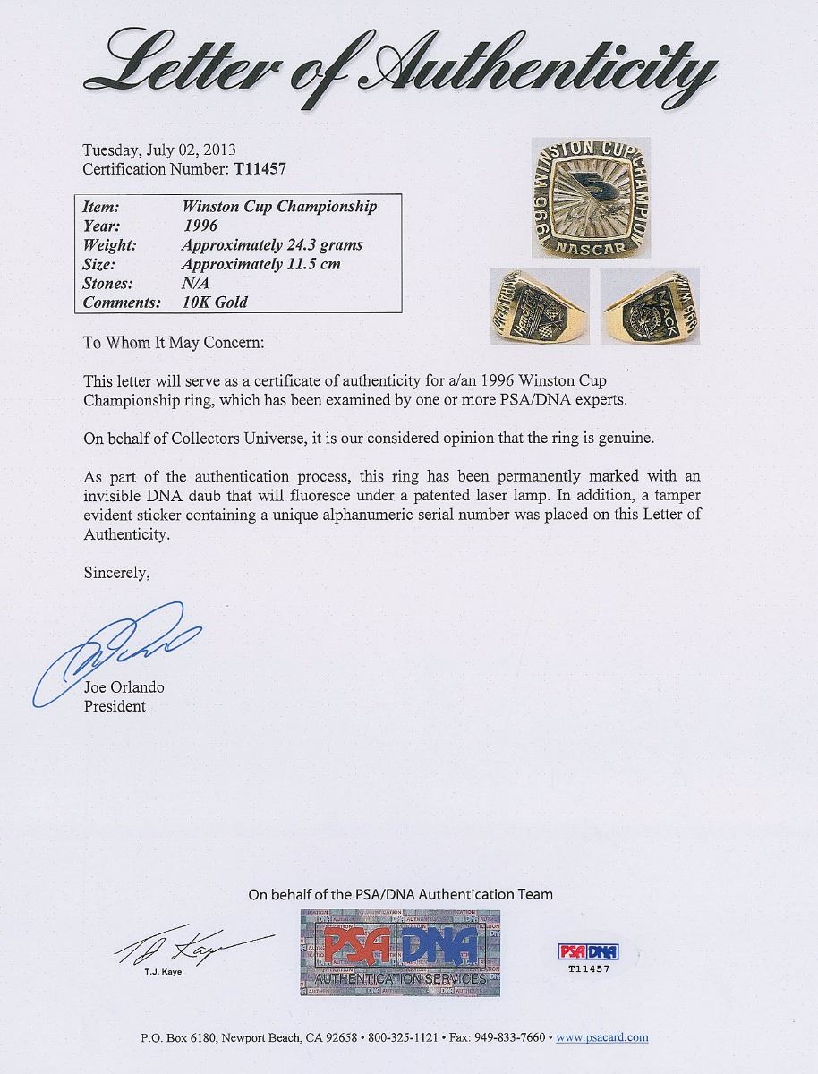 A 10K gold 1996 Winston Cup championship ring, approximately 11.5 cm in size and 24.3 grams, featuring the car number “5” and the facsimile signature of winner Terry Labonte on the top. One side features the Hendrick Motorsport logo with checkered flags, and the other side features the Winston Cup Series logo and engraved name “Mack,” presumably a team or staff member. In fine condition. Accompanied by a full letter of authenticity from PSA/DNA.