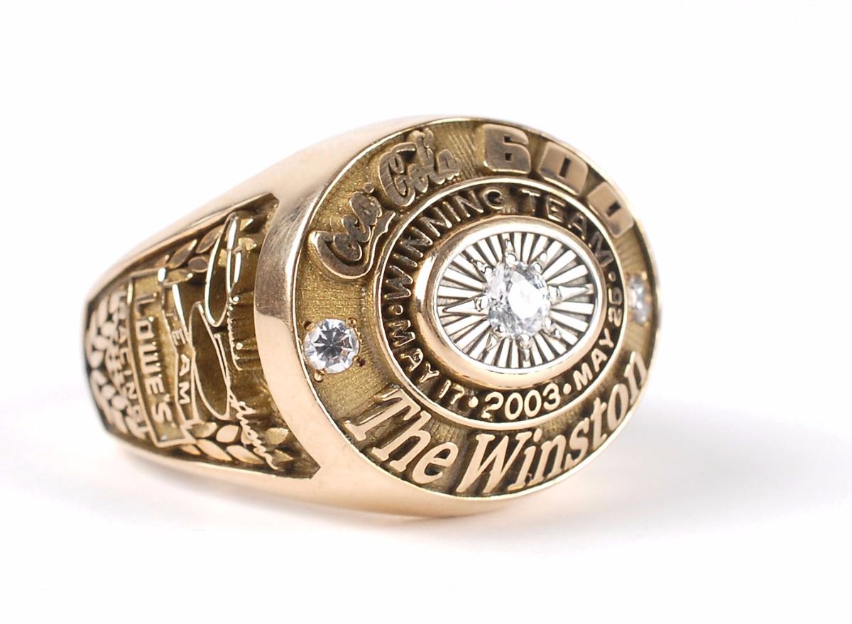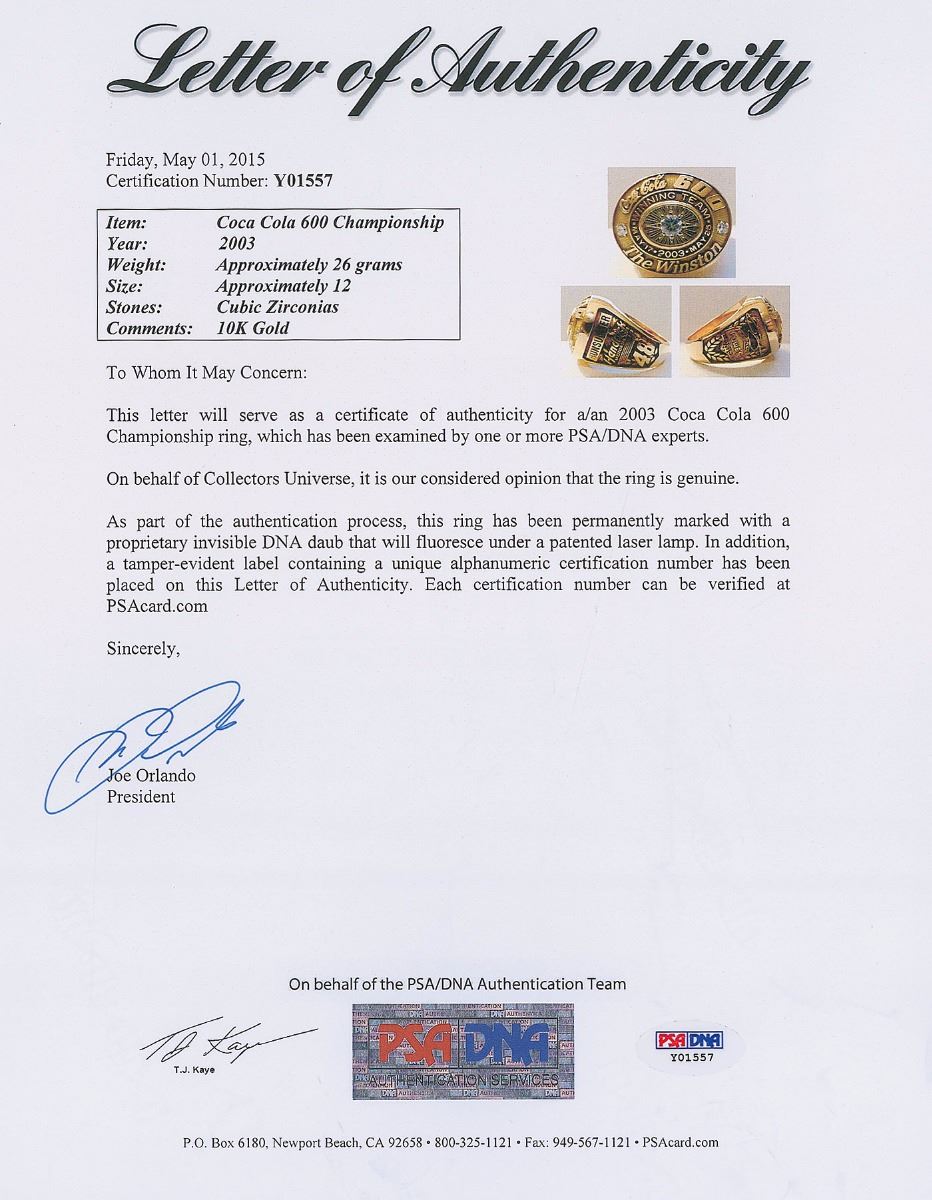 A 10K gold 2003 Coca-Cola 600 championship ring, approximately size 12 and 26 grams, featuring three cubic zirconias on the top. One side features the facsimile signature of winner Jimmie Johnson and a Lowe’s Racing logo, and the other side features a Hendrick Motorsports logo, the car number “48,” and engraved name “Hunsucker,” presumably a team or staff member. In fine condition. Accompanied by a full letter of authenticity from PSA/DNA.