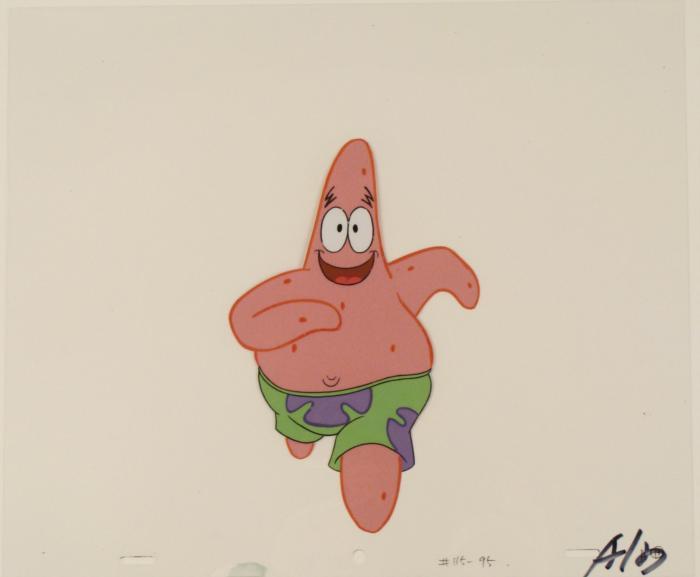 To create production cels, the original animator's drawing is transferred onto an acetate cel (by hand-inking and/or photo copying). The cel is then hand-painted on the reverse side. The cel is ready to be matted and framed. The animator's notations are at the bottom of the cel. There is some slight paint fade to Patrick's outline.