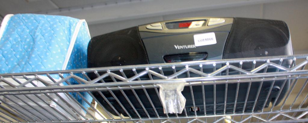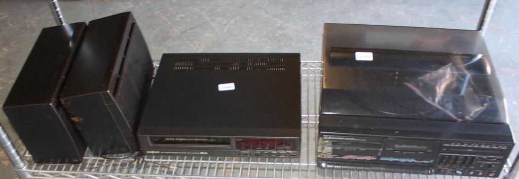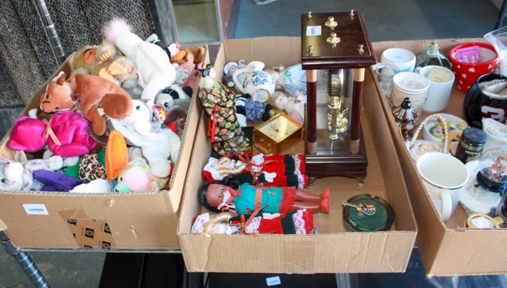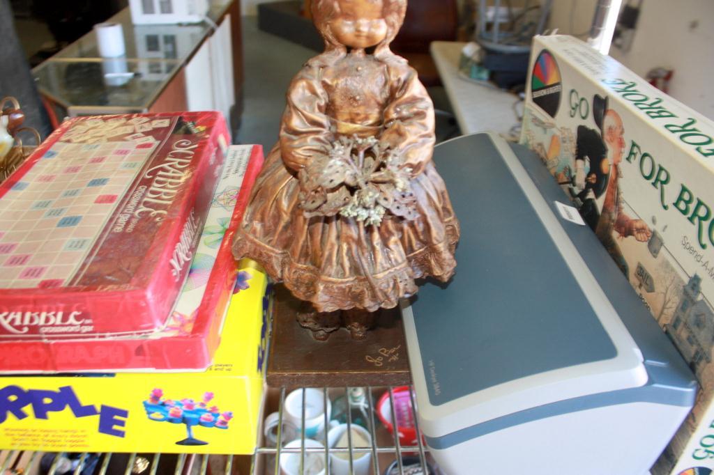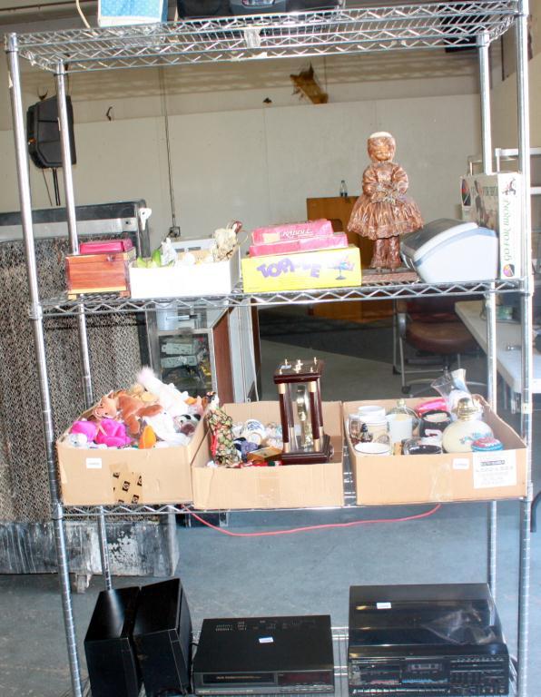 Rack Of Misc. VCR, Dolls, Cups, Statue, Clock