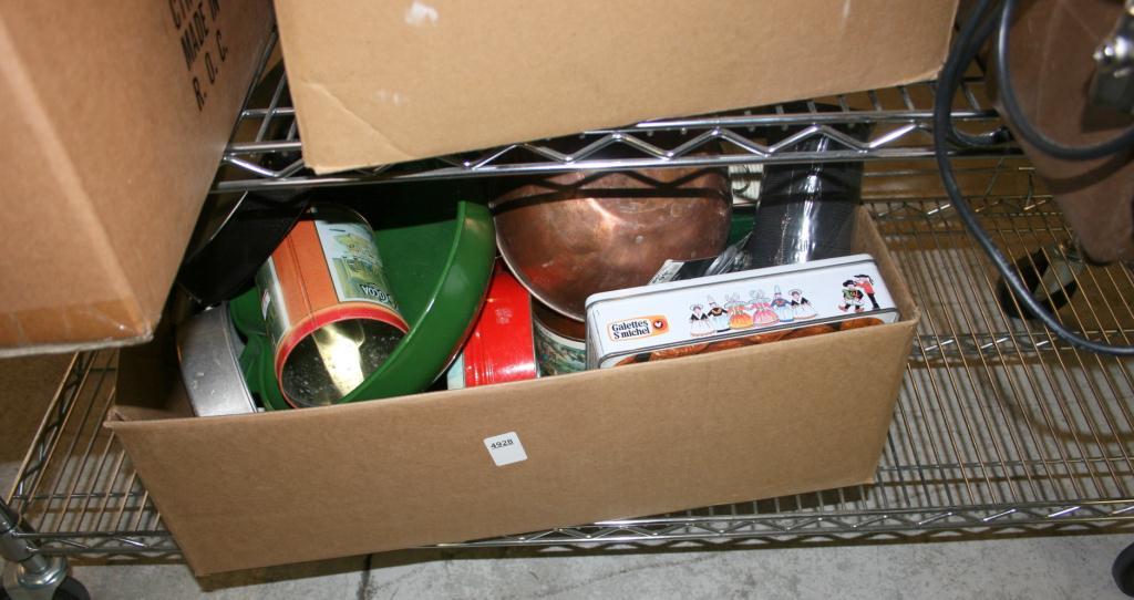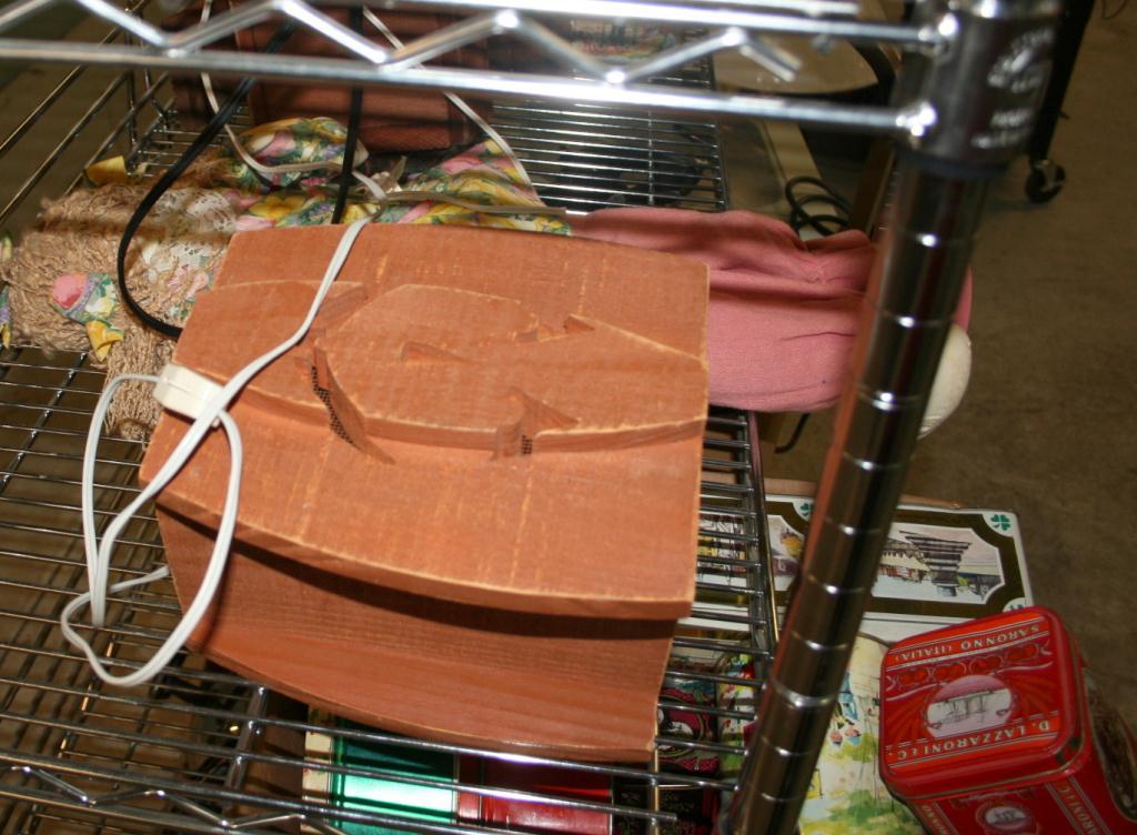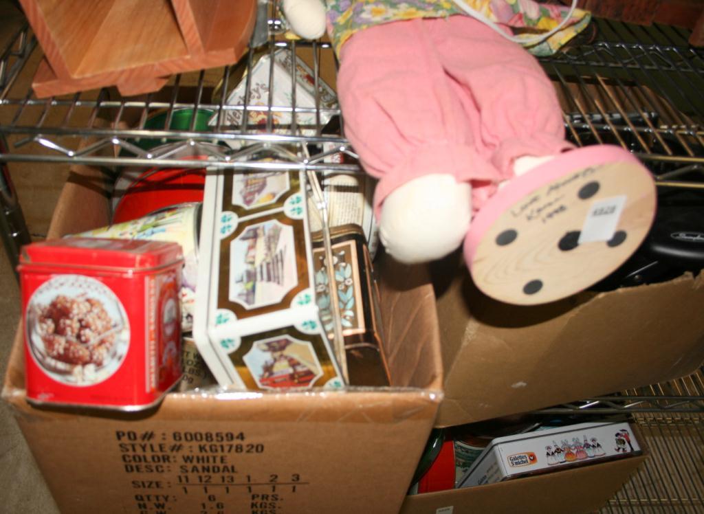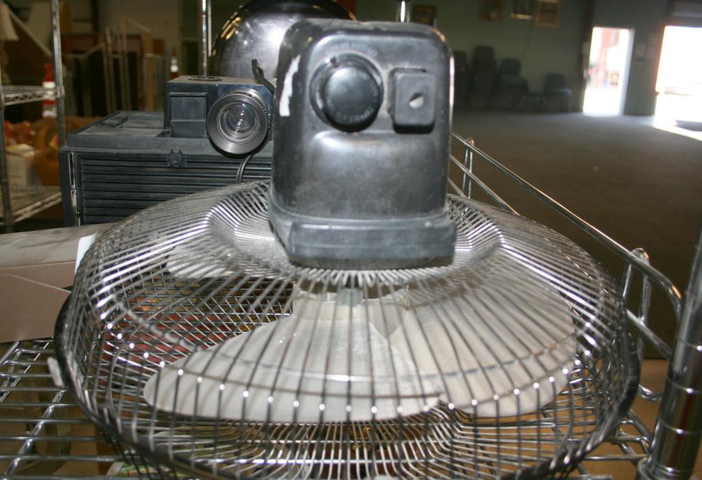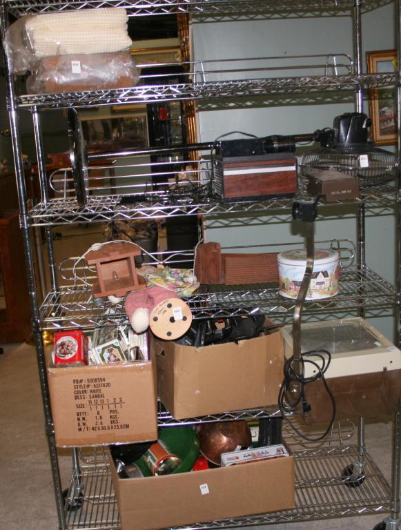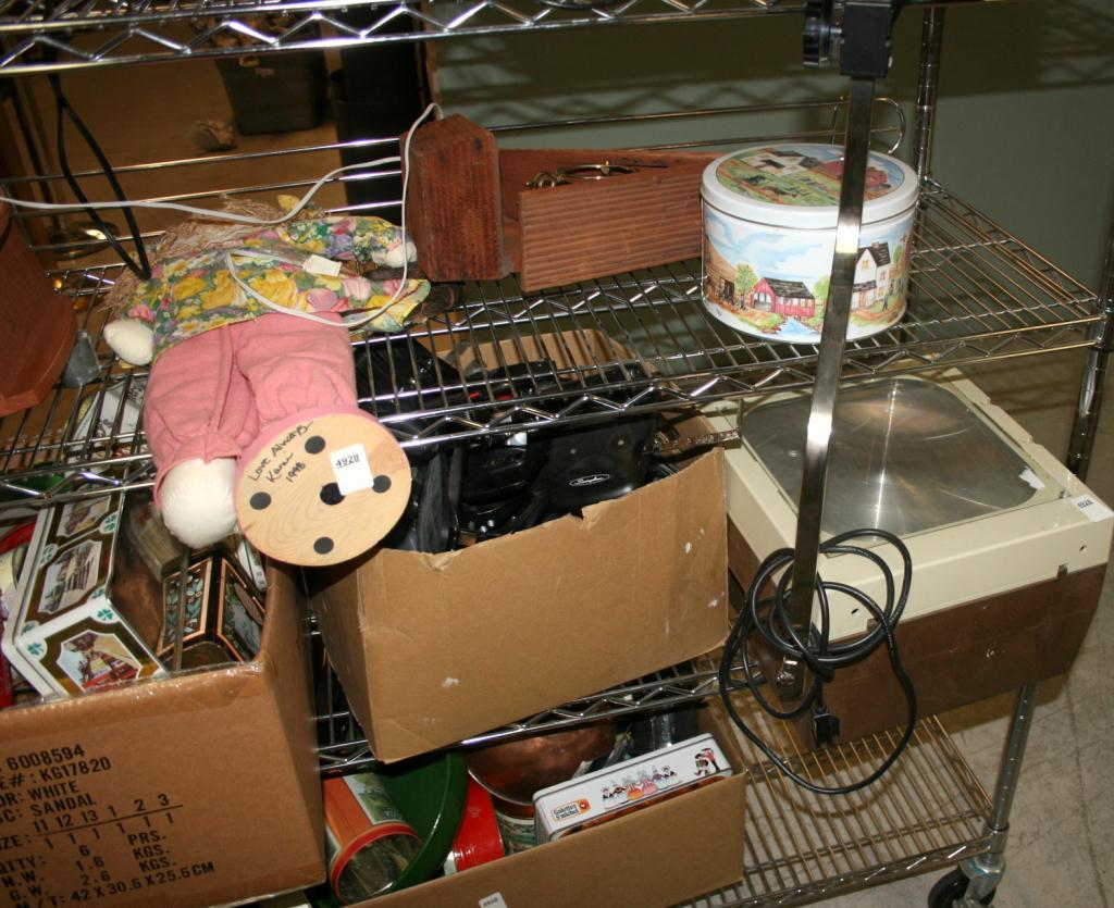 Rack of Misc. Fan, Overhead Projector, Tins, Doll,
