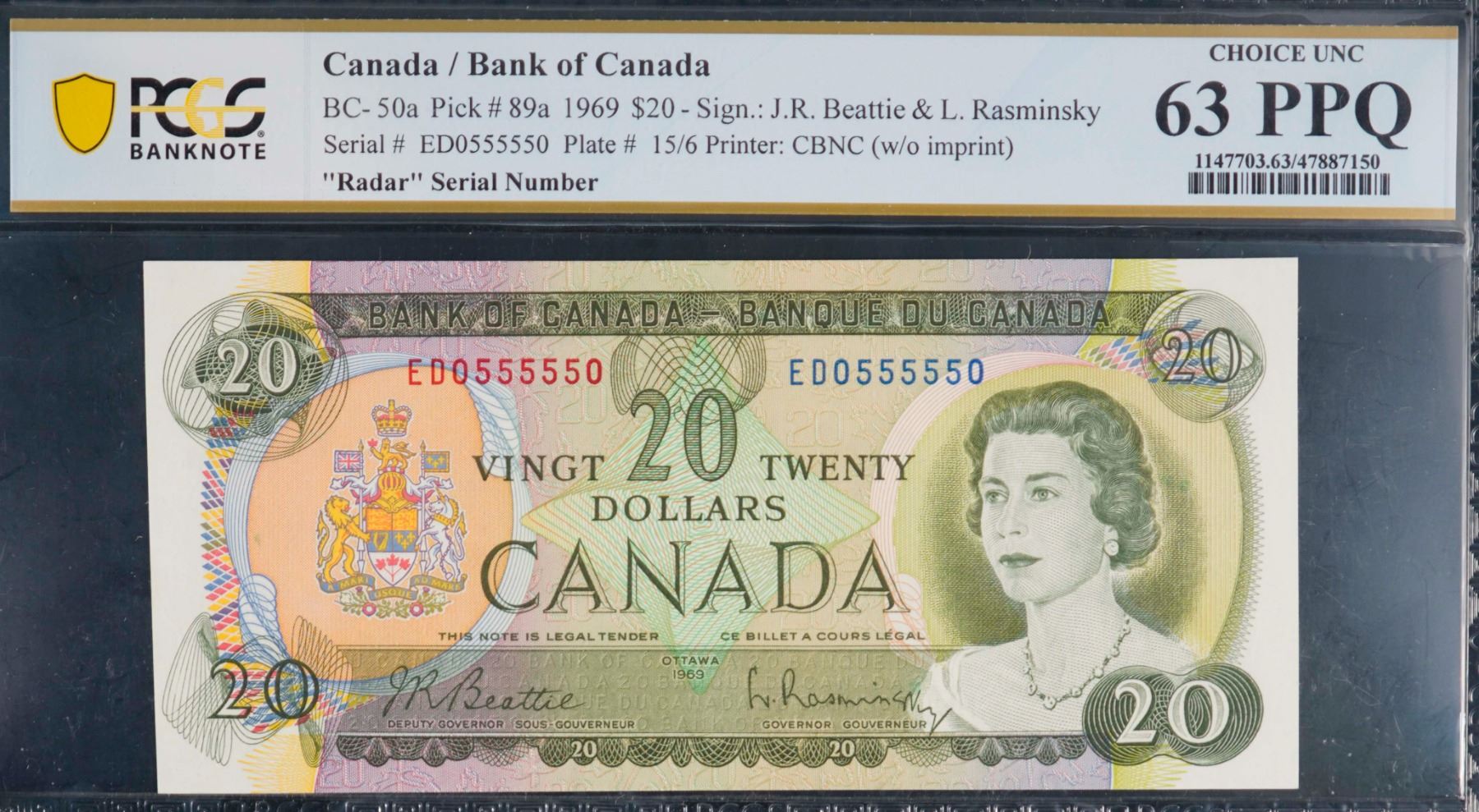 Radar; 1969 $20 BC-50a #ED0555550, PCGS Choice Uncirculated-63PPQ. Two Digit Radar.
