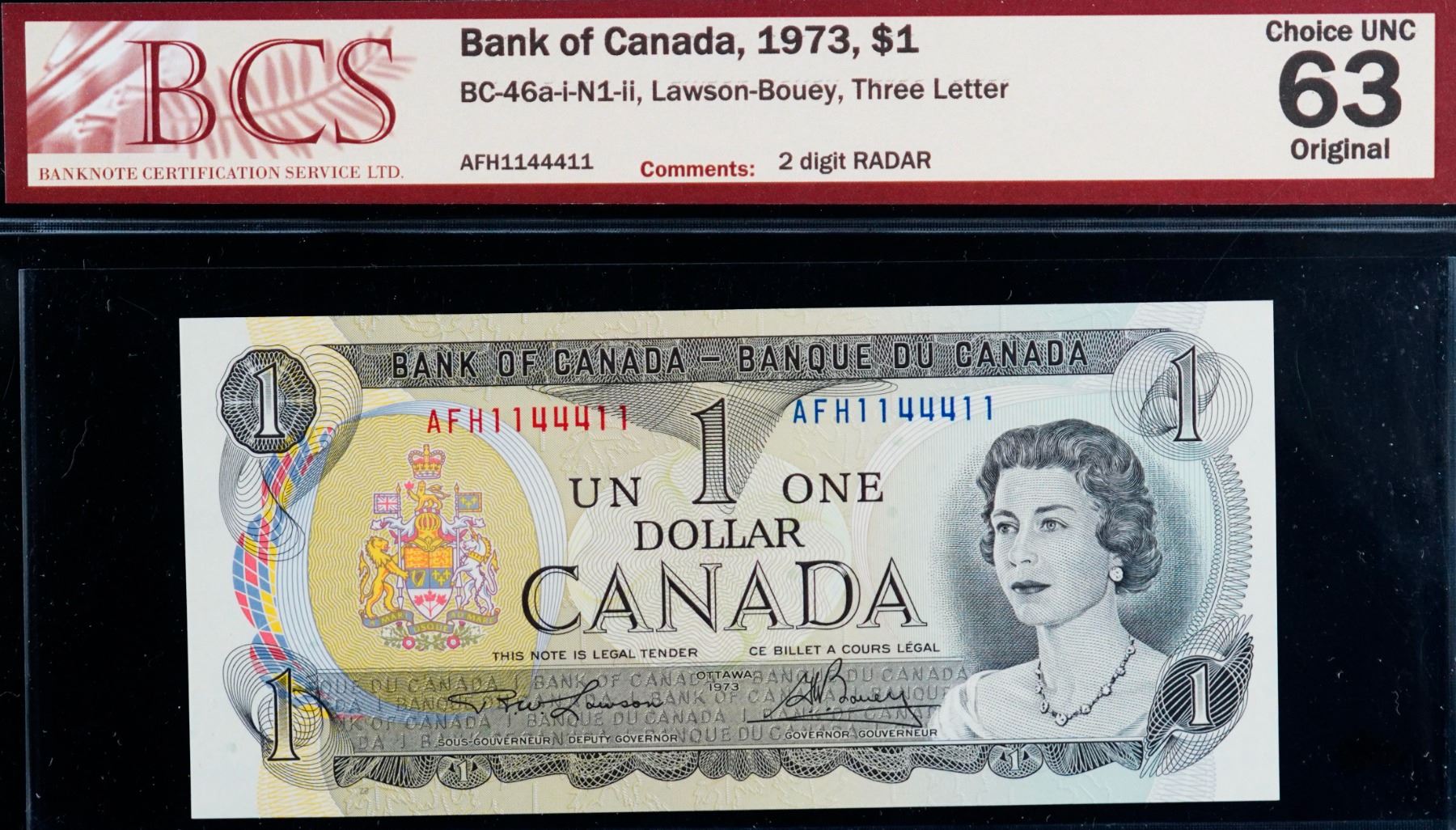 Radar; 1973 $1 BC-46a-i 2 Digit Radar #AFH 1144411 BCS Choice Uncirculated-63.