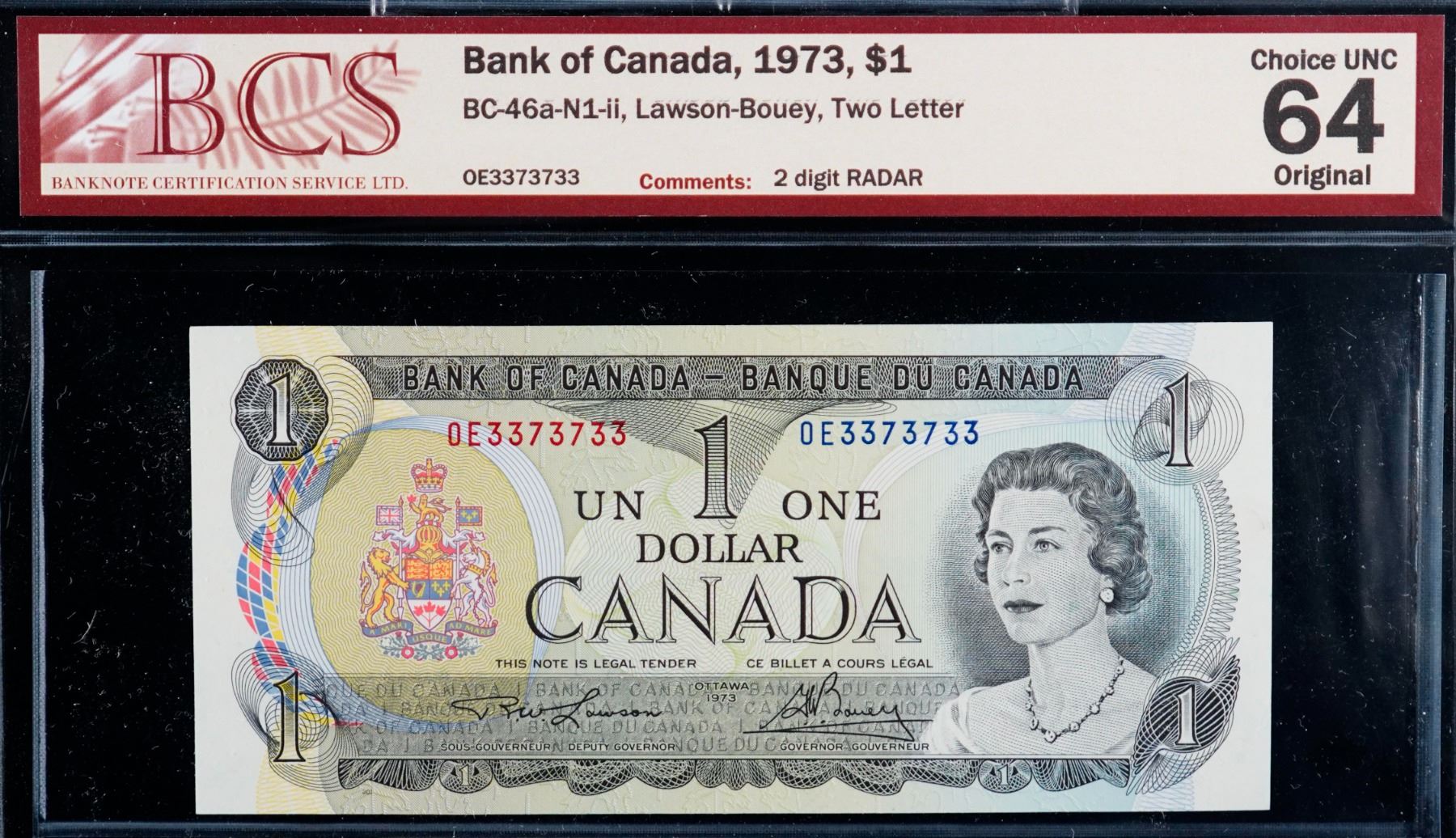 Radar; 1973 $1 BC-46aN1-ii 2 Digit Radar #OE3373733 BCS Choice Uncirculated-64.