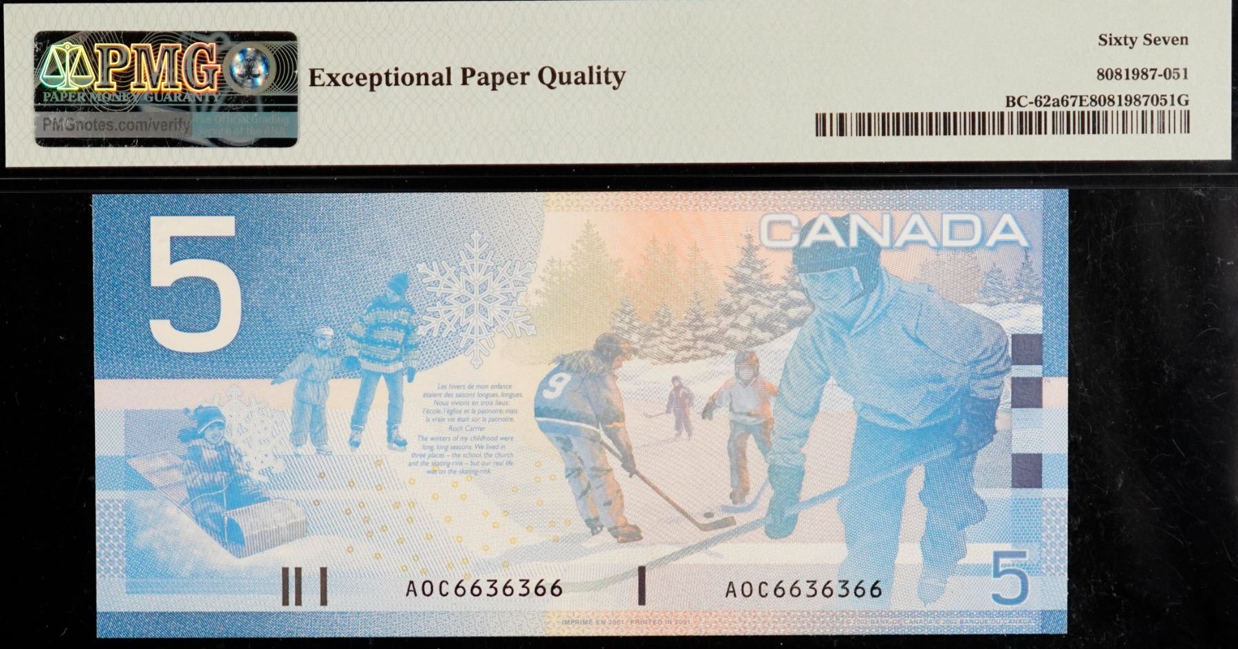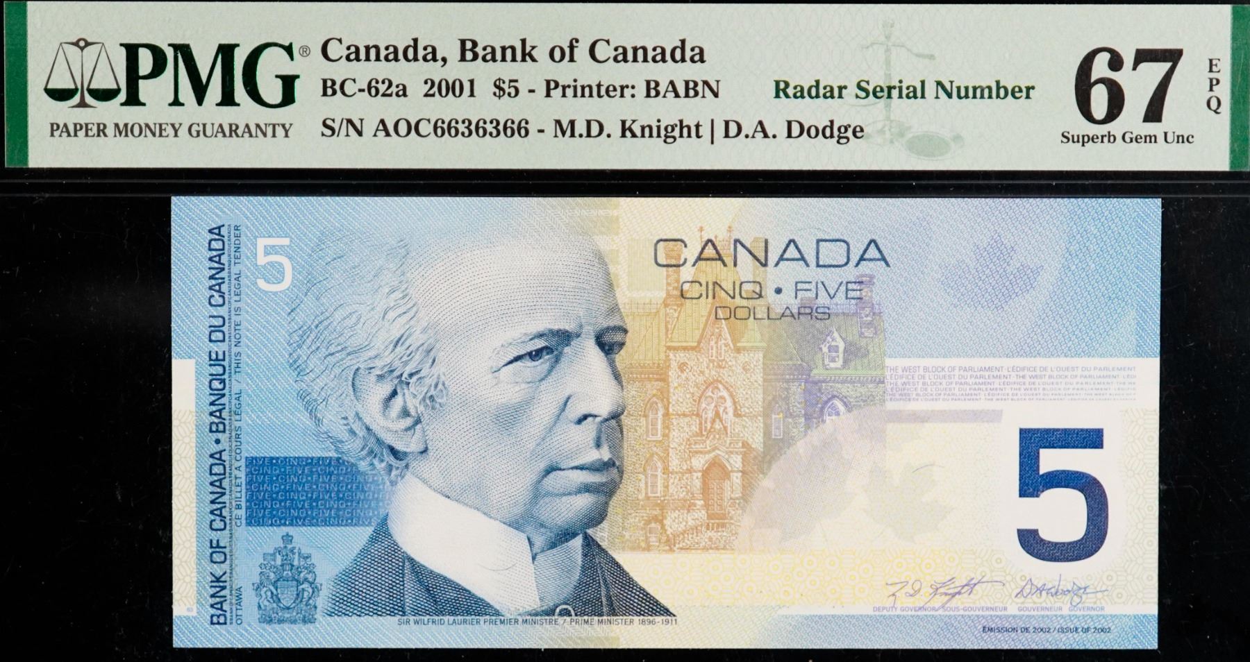 Radar; 2001 $5 BC-62a 2 Digit Radar #AOC6636366 PMG Superb Gem Uncirculated-67EPQ.