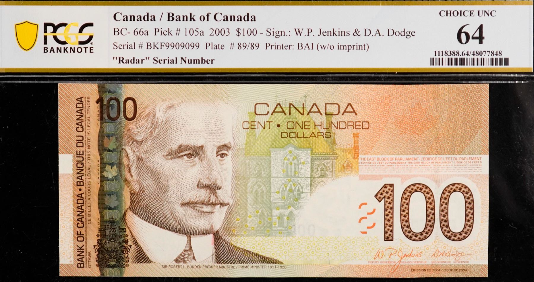 Radar; 2003 $100 BC-66a 2 Digit Radar #BKF9909099 PCGS Choice Uncirculated-64.