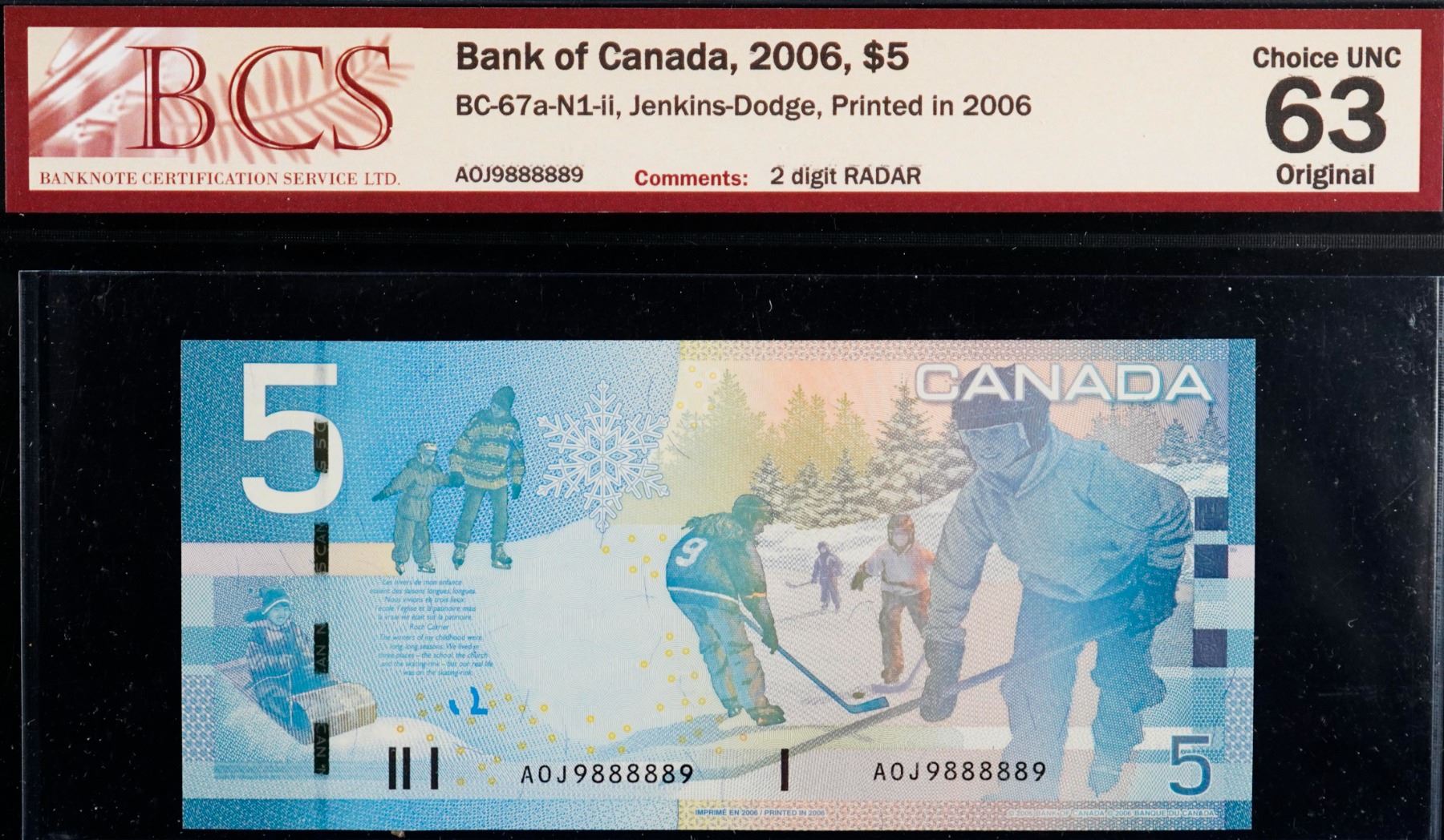 Radar; 2006 $5 BC-67a 2 Digit Radar #AOJ9888889 BCS Choice Uncirculated-63.