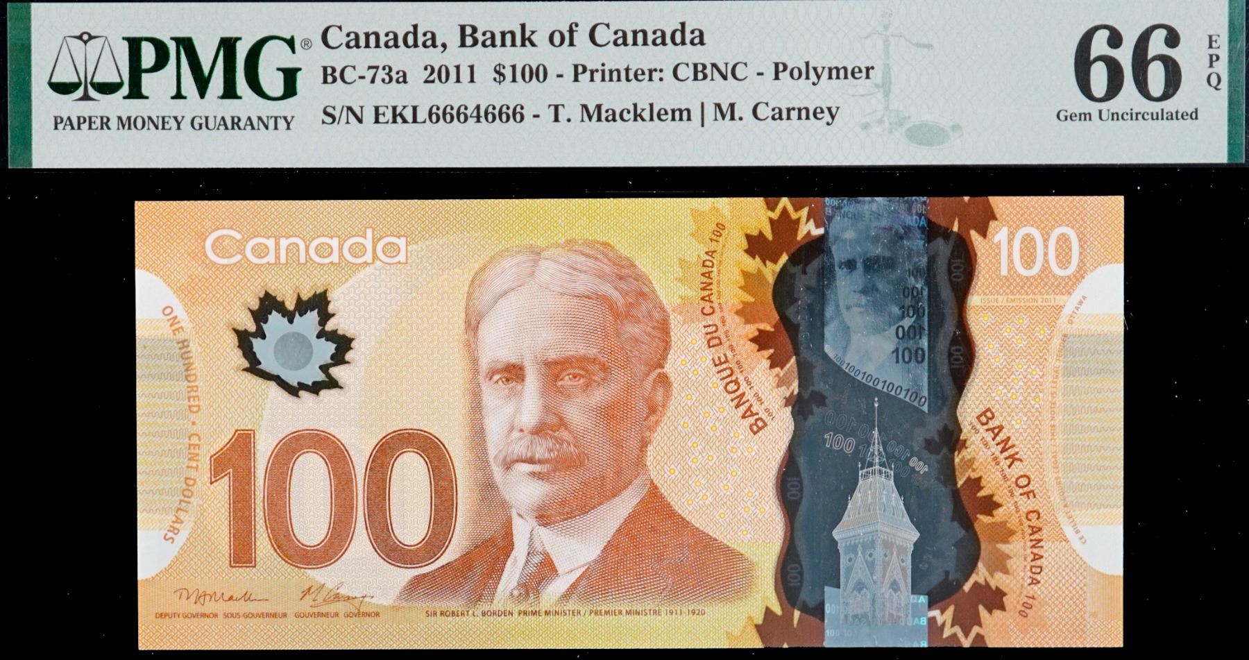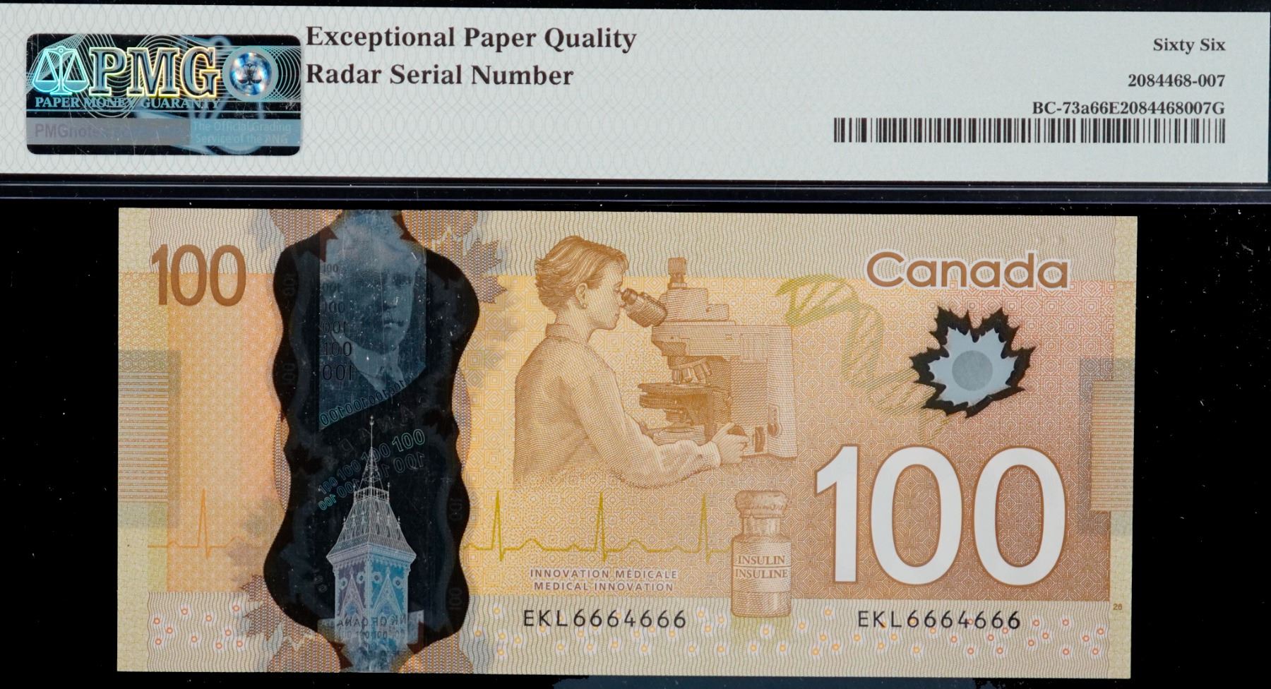 Radar; 2011 $100 BC-73a #EKL6664666, PMG Superb Gem Uncirculated-66EPQ. Two digit radar