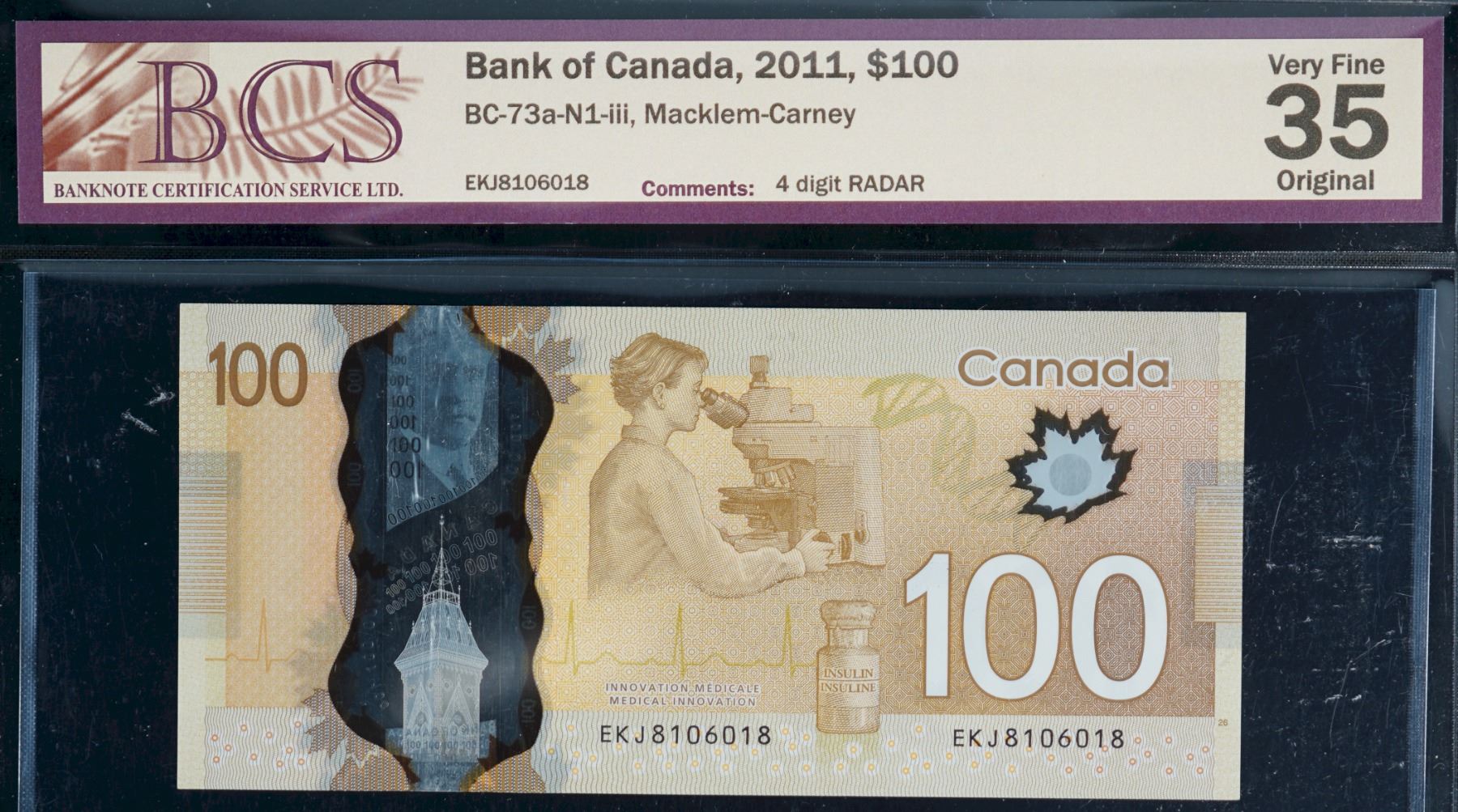 Radar; 2011 $100 BC-73a-N1-iii #EKJ8106018 BCS Choice Very Fine-35