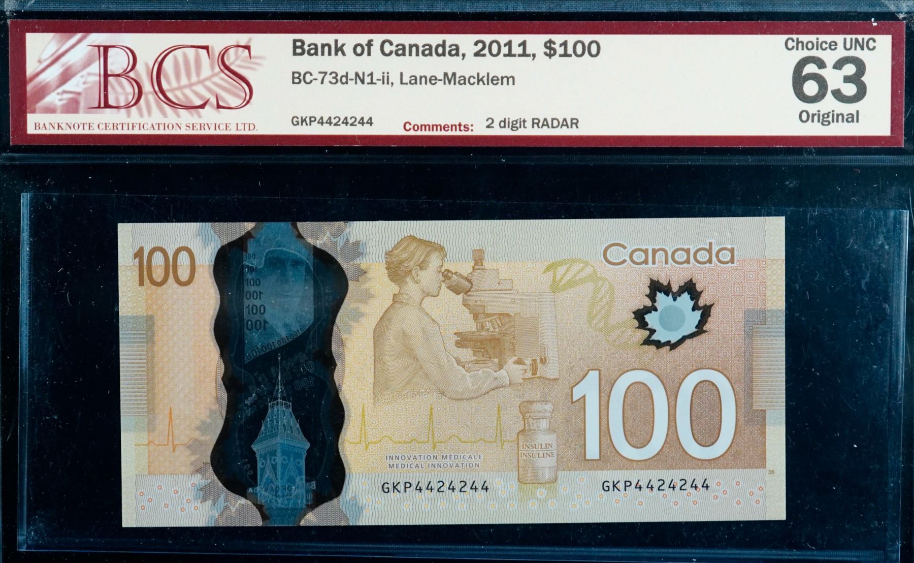 Radar; 2011 $100 BC-73d 2 Digit Radar #GKP4424244 BCS Choice Uncirculated-63.
