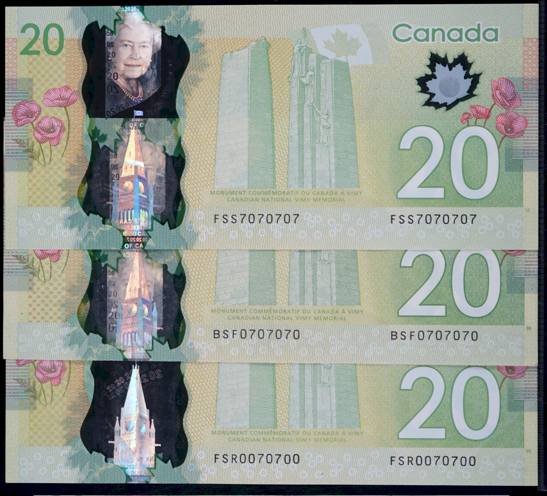 Radar Notes; 2012 $20 #FSR0070700, #BSF0707070, #FSS7070707. Lot of Two-Digit Radar/Repeater notes