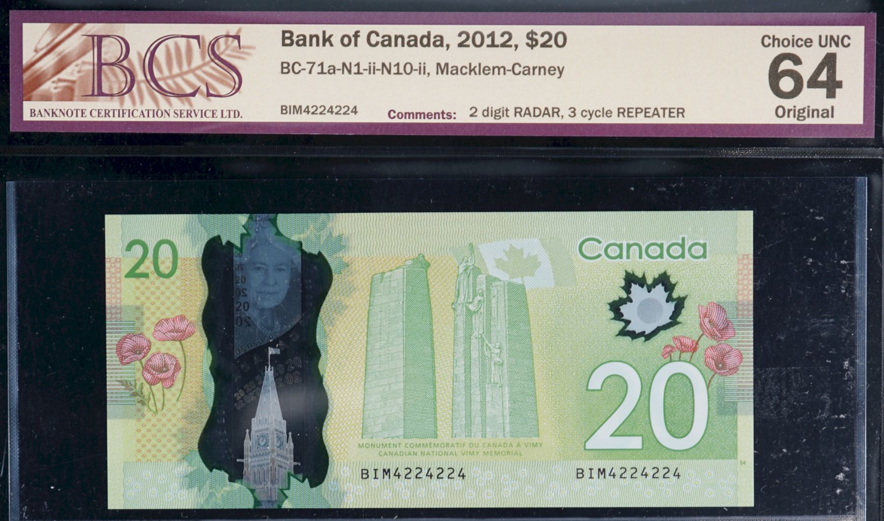 Radar & Repeater; 2012 $20 BC-71a-N1-ii-N10-ii #BIM4224224 BCS Choice Uncirculated-64