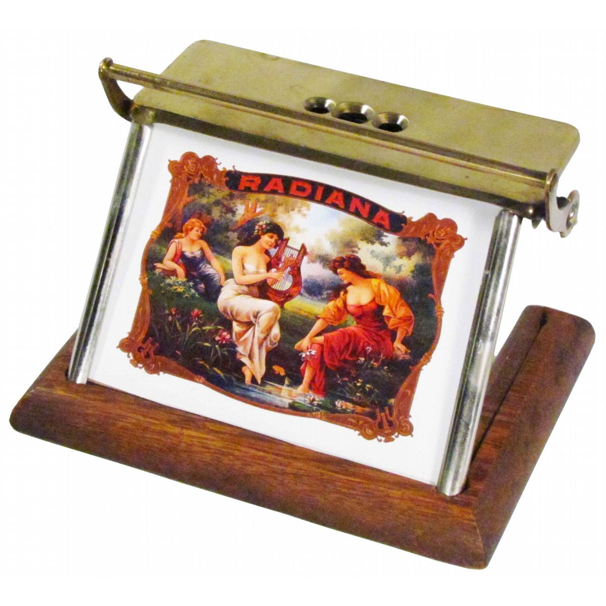 Radiana Cigar Tip Cutter. Brass, Nickel and Wood. Professionally restored condiition. 8 1/4 X 5 1/2 X 6 1/4 inches.