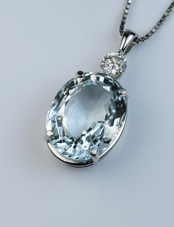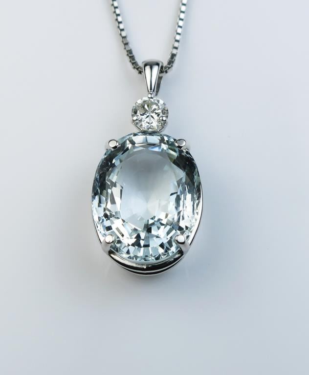 featuring a 15.80 carat oval cut Aquamarine accented with a round cut Diamond weighing 0.53 carats with G-H color and VS clarity set in 14 karat white gold. Retail $5,000-$6,000