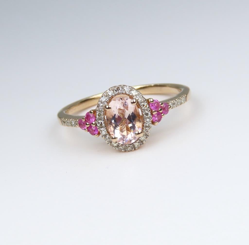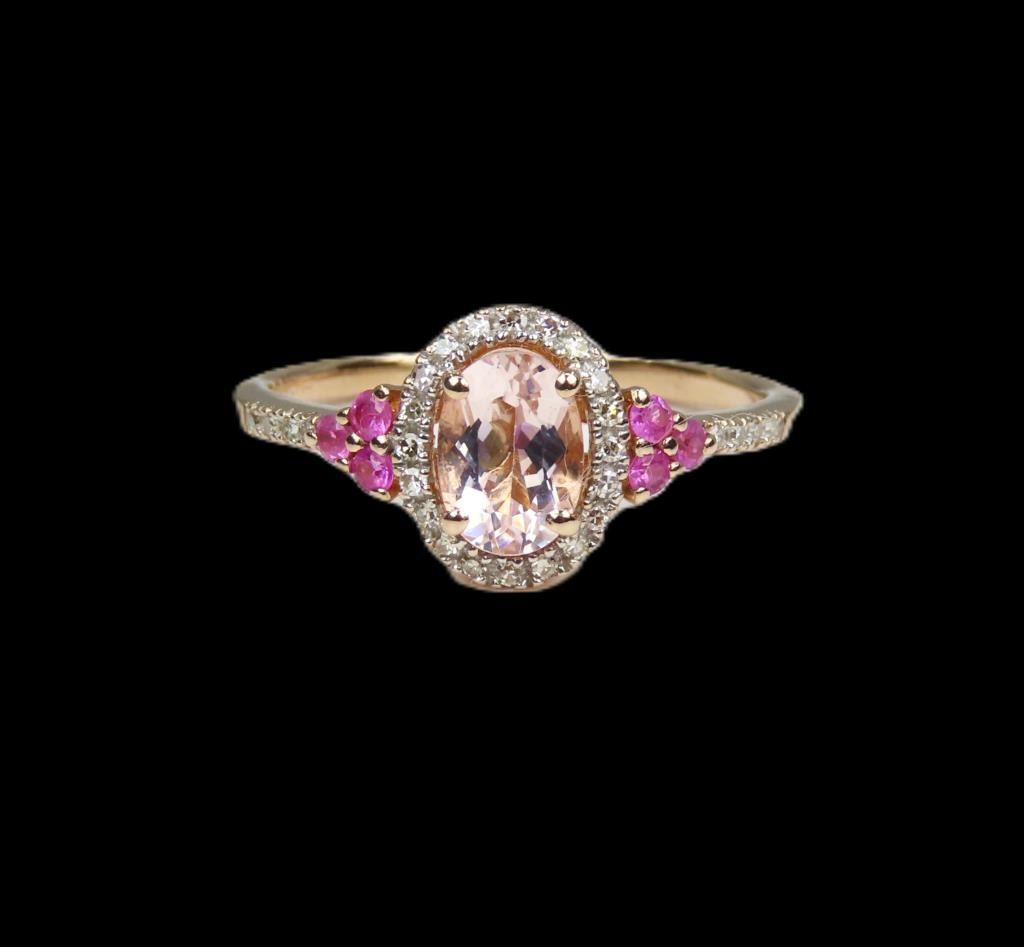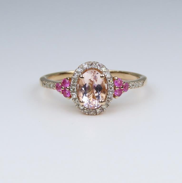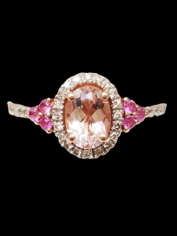 and Diamond Ring featuring an oval cut Morganite accented with 6 round cut Pink Sapphires and 20 round cut Diamonds with a total combined gem weight of approx. 3.00 carats set in a 10 karat rose gold, halo style setting, ring size 8.