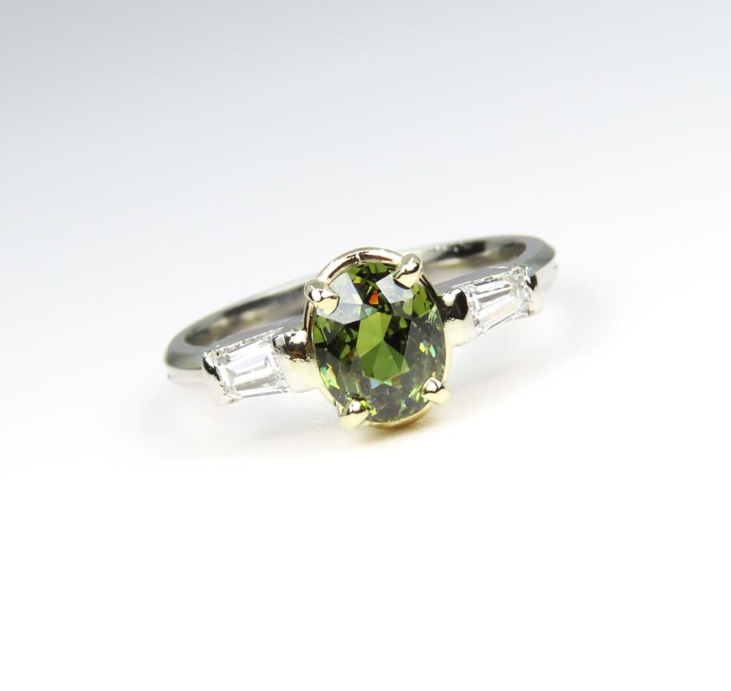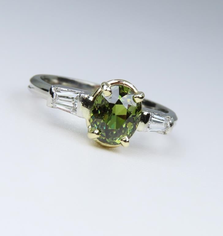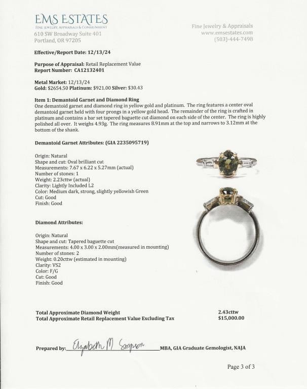 Ring featuring a Rare G.I.A. Certified Green Demantoid Garnet weighing 2.23 carats accented with 2 baguette cut Diamonds weighing approx. 0.30 carats with F-G colors and VS clarity set in a custom Platinum and 14 karat yellow gold setting, Size 7 ¾. Full Appraised Retail Value - $15,000.00