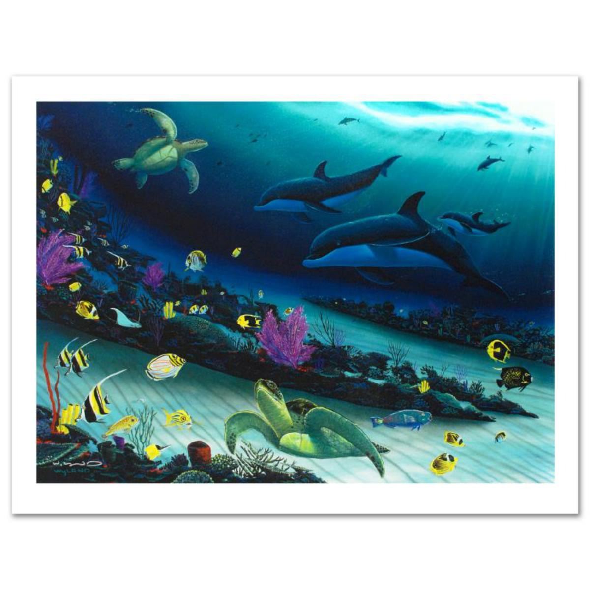 Wyland is renowned internationally for his incredible depictions of life under the sea. Full of careful details and vibrant colors, his work is collected all over the world. "Radiant Reef" is a limited edition giclee diptych on canvas by Wyland, numbered and hand signed by the artist. This piece comes in two adjoining panels, one of which bears the numbering for the piece, the other of which bears the artist's hand signature; it is intended to be displayed as a diptych. Includes Certificate of Authenticity! Each panel measures approx. 35" x 26" (image). Reference #: 200496.