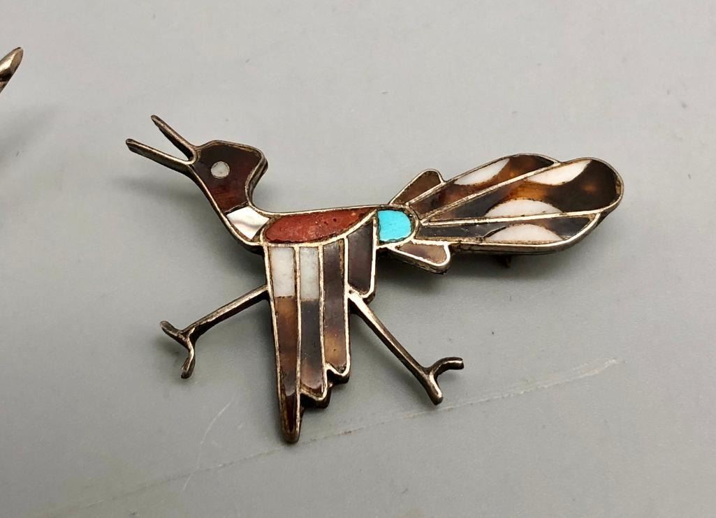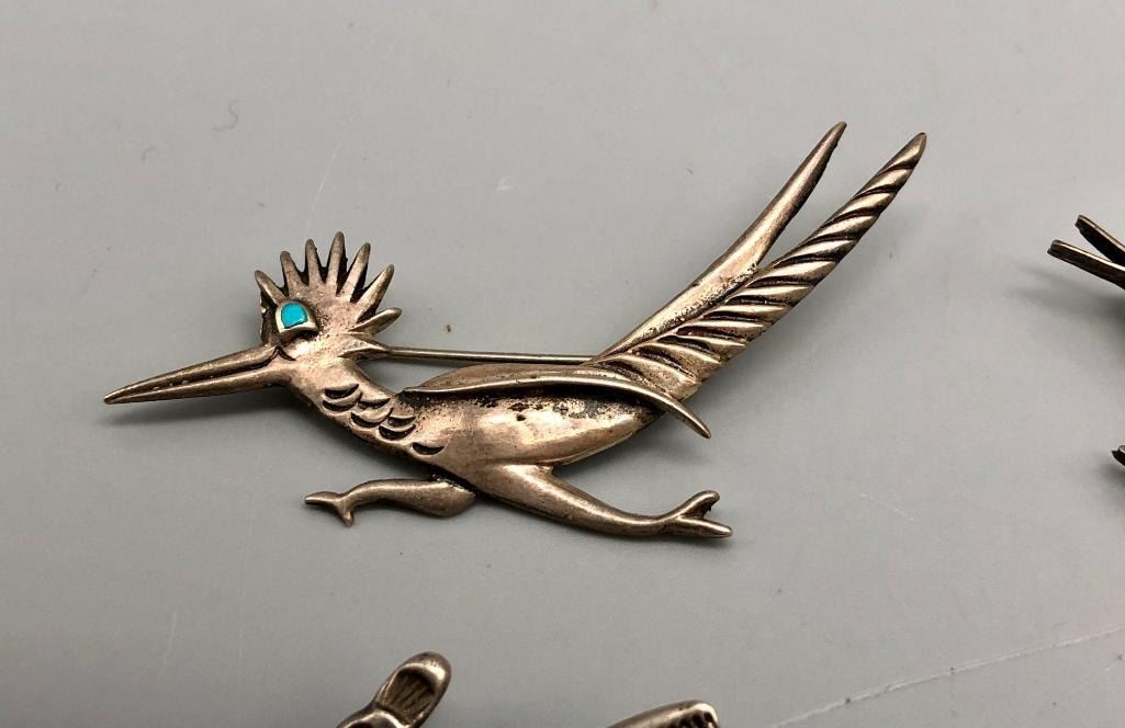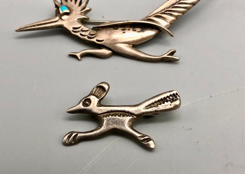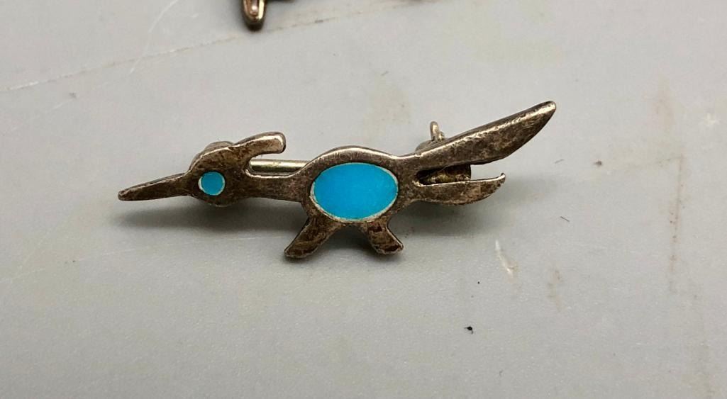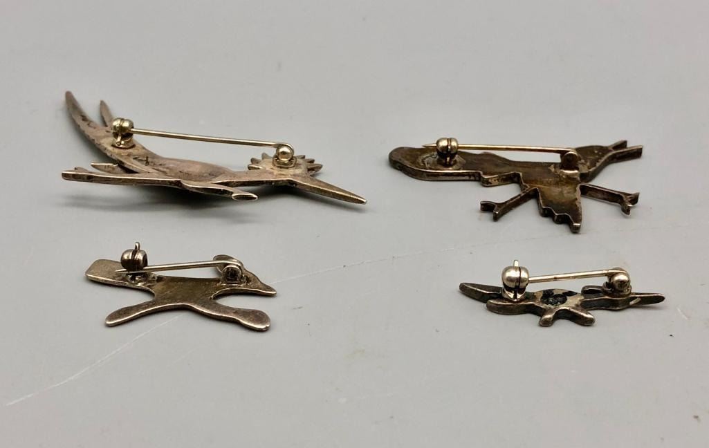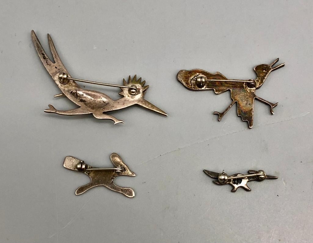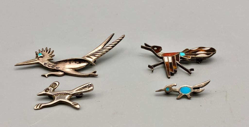 Presented for sale in this lot is a group of radiant roadrunner themed pins. All are various sizes and styles. Three of the four pins are set with various stones and one is solid silver. All are made from sterling silver. MAKER: Unmarked. APPROX AGE: Vintage. SIZE: Various. Combined weight is 18.4 grams. CONDITION: Good for their age, normal wear expected. Please look closely at the pictures as they are an important part of our description and are hereby incorporated into the description, specifically with regards to condition. SHIPPING: There will be a $5 handling / packaging fee for shipping this lot. The actual cost of postage will be added on top of that. BUY IT NOW: If you would like to buy this item now, without waiting for the auction day to bid on it, we do offer this option (which is available up to 48 hours before the actual auction starts). The “Buy it Now†price is the high estimate of this lot (plus applicable fees and the Buyer's premium is discounted to 10% when using the Buy it Now option). If you would like to exercise this option, you must contact us by email (or phone as long as you talk to someone live). Reference this lot number and your intention to "Buy it Now."