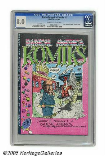 <B>Radical America Komiks #1 (Rip Off Press, 1969) CGC VF 8.0 Off-white to white pages.</B></I> A classic early compilation featuring Gilbert Shelton, S. Clay Wilson, Victor Moscoso, and Jay Lynch. The Freak Brothers and Wonder Warthog appear in stories by Shelton. First printing, with Lester Maddox's 2-tone saddle shoes on the cover. CGC census, 3/05: 1 in 8.0, none higher.