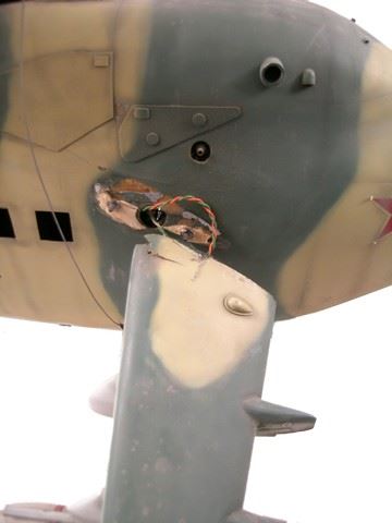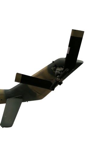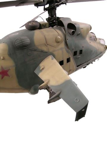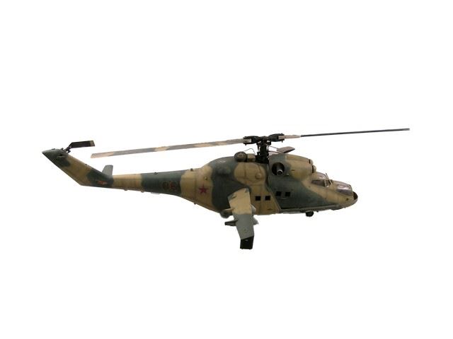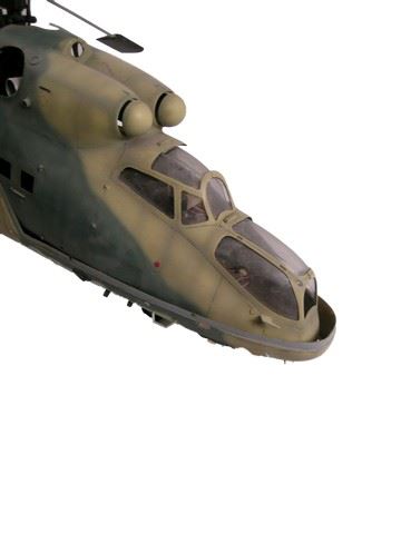 This is a radio controlled Russian Hind miniature camouflage helicopter. This appears complete with rotor blades and tail rotor. This was created by the Academy Award winning team of Grant McCune Design and is from an unknown production. (approx. 56" x 24")