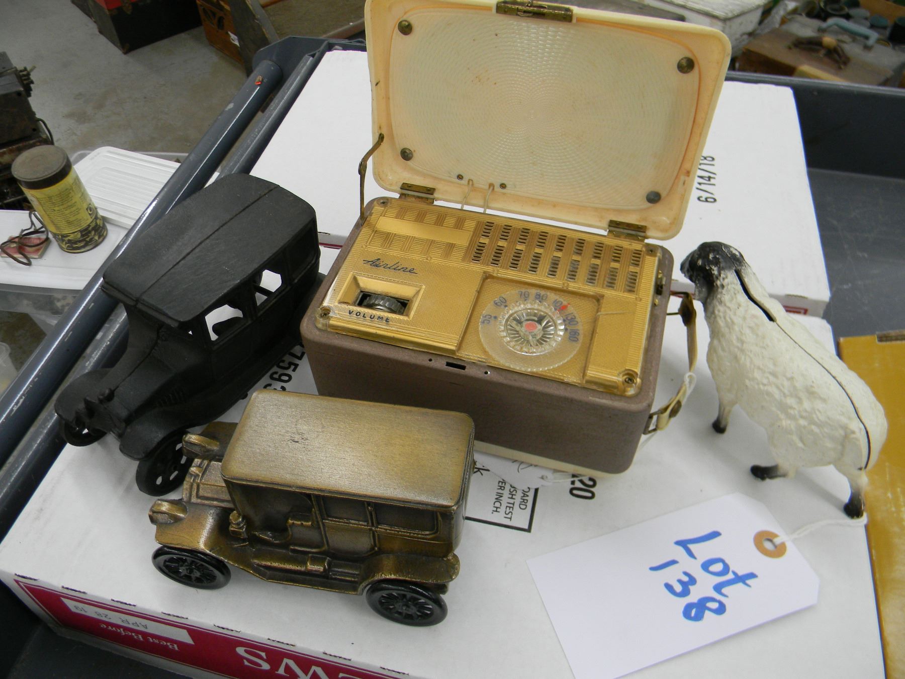 Flat with 2 cast iron banks and metal car; cute Airline small portable radio - works good