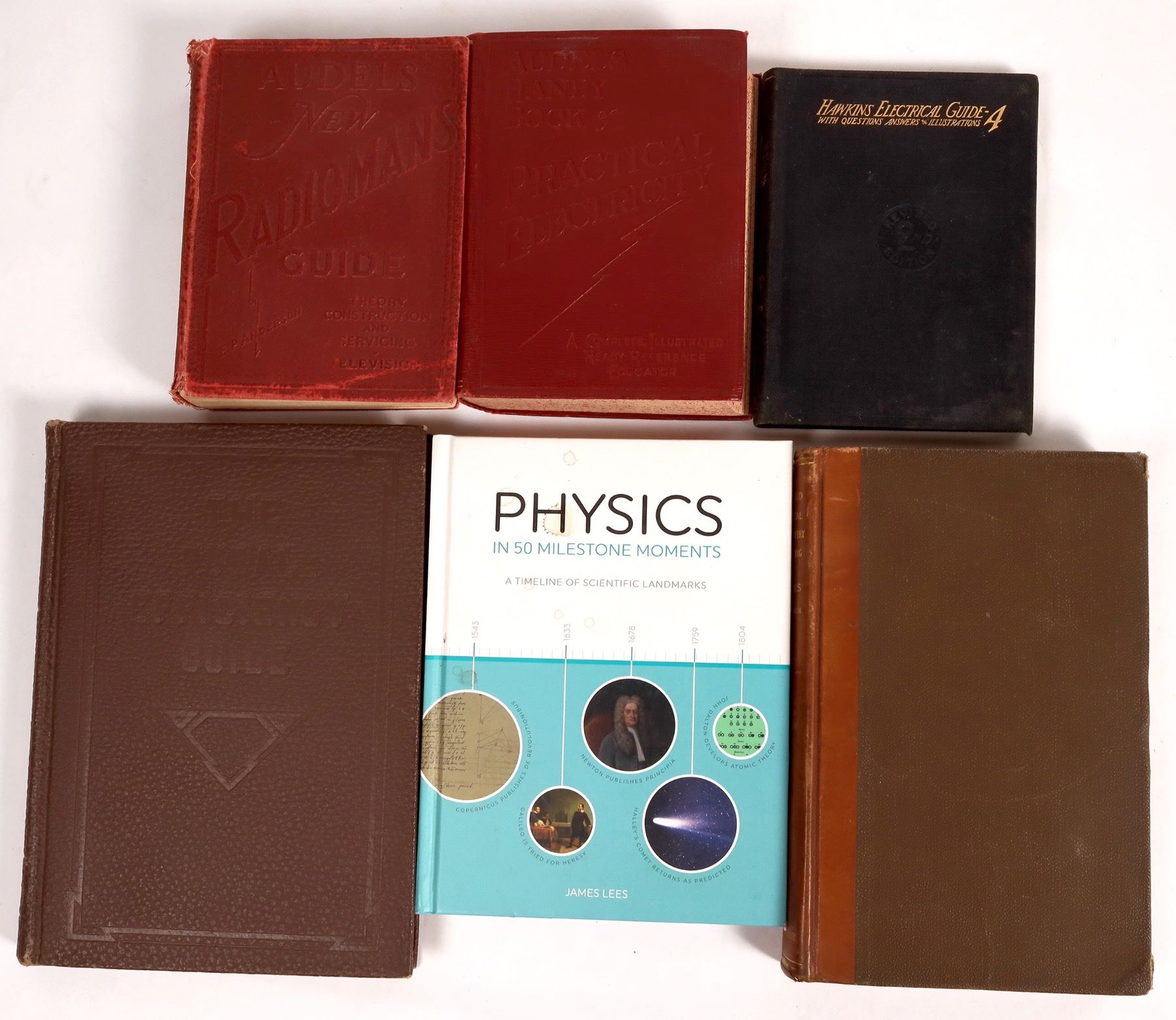 4 books. Audel's Radiomans Guide by Anderson 1942. Audel's Handy Book of Practical Electricity. Physics in 50 Milestones by Lees. Plane and Spherical Trigonometry by Ginn 1903. Hawkins Electrical Guide 4 1917. The Rural Efficiency Guide Vol. 2 by Yeoman 1920.
