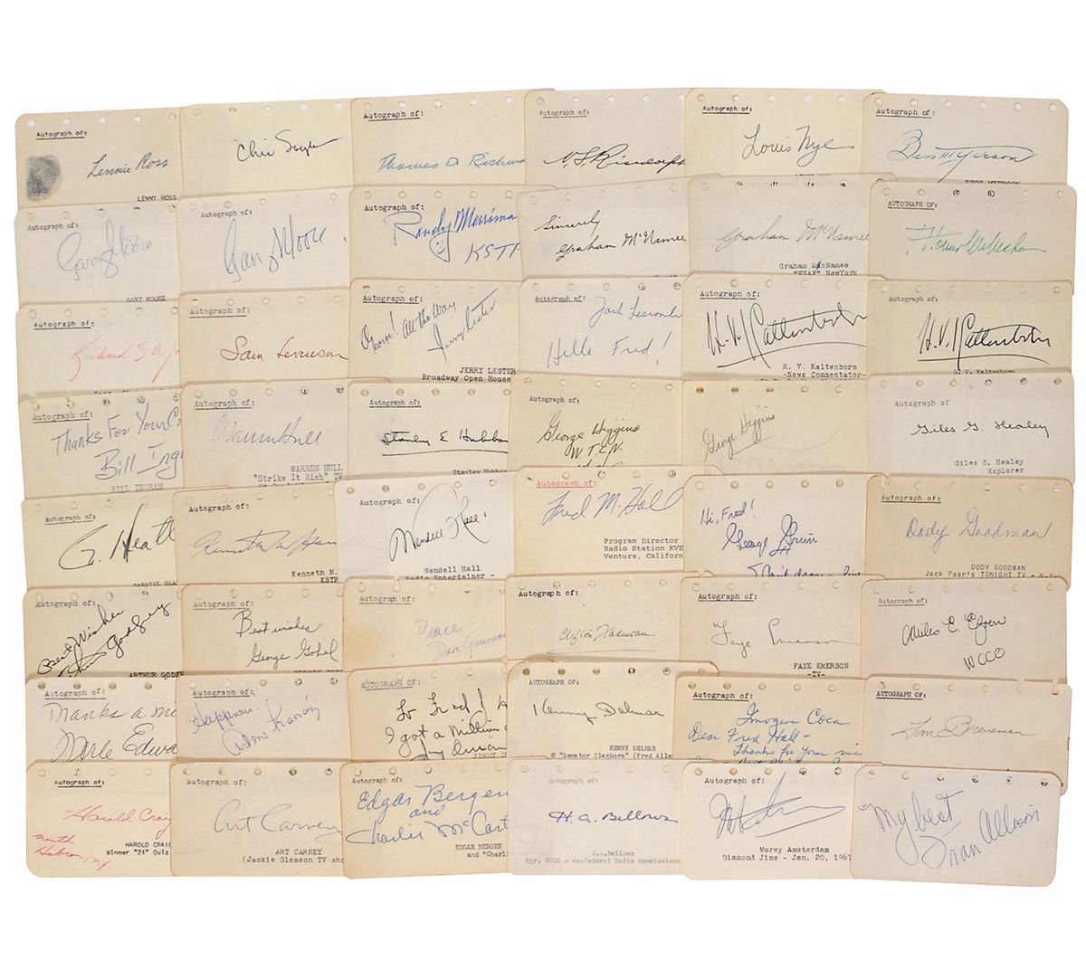 Collection of approximately 64 signatures of various entertainers, the vast majority in ink with a few in pencil, primarily on individual off-white 4.5 x 2.5 pages, some lined. Signers include: Edgar Bergen, Art Carney, Jimmy Durante, Ed Sullivan, Al Schacht, Phil Silvers, Jonathan Winters, and Ed Wynn. In overall fine condition, with light edge toning.