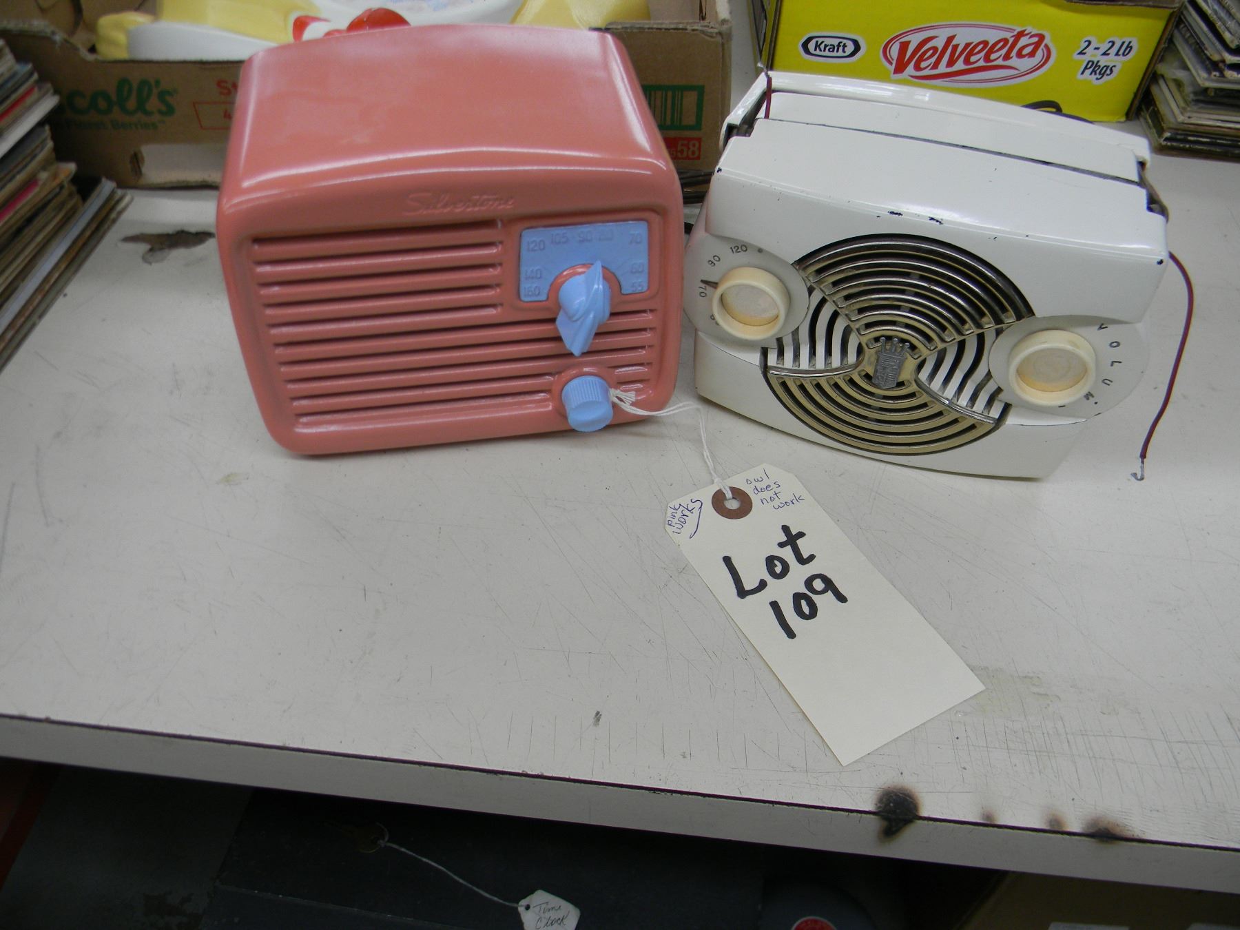 two radios, one is Silvertone metal model 6002, works; white Zenith owl radio; cabinet issues
