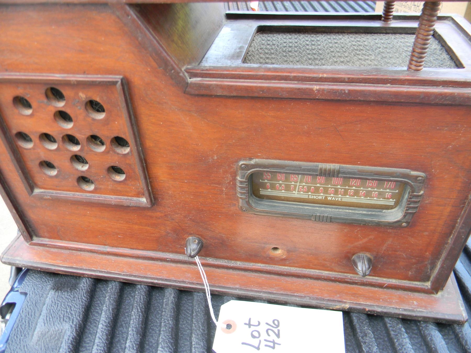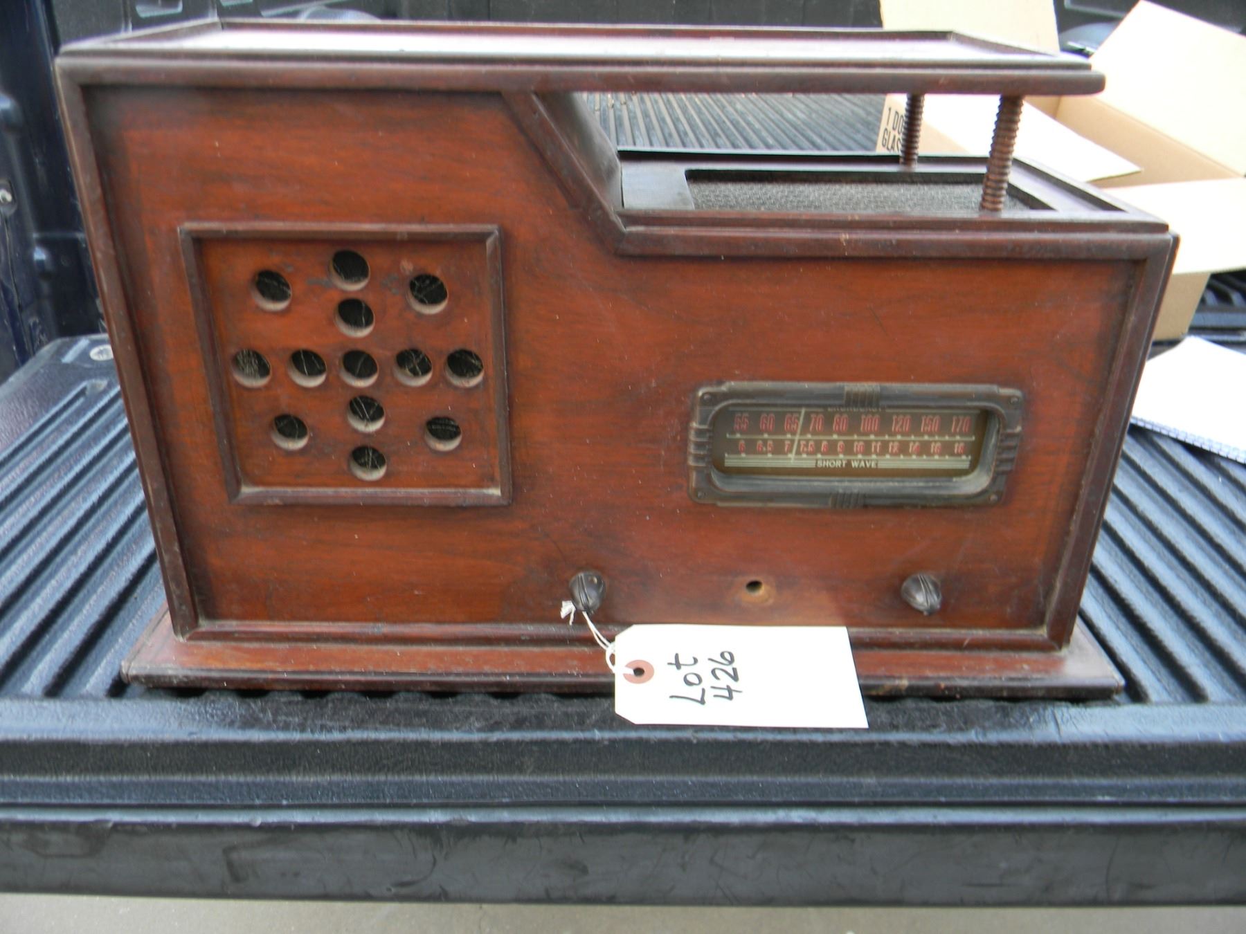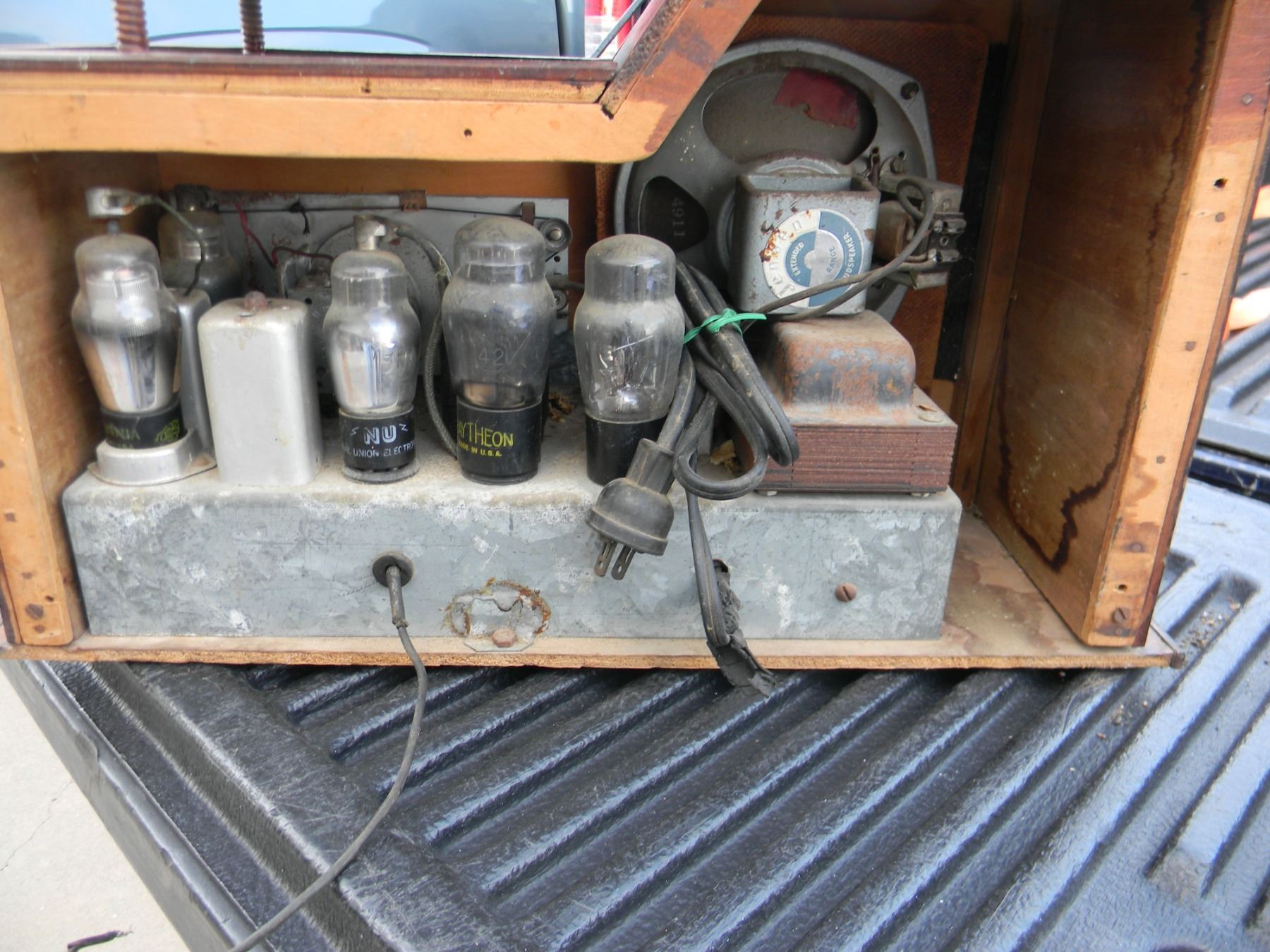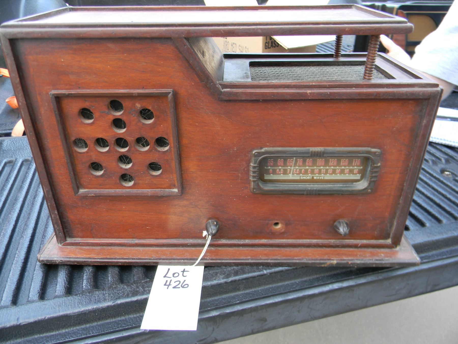 Unknown model radio in unusual cabinet. Possible that this cabinet was made in a high school wood shop class; nice