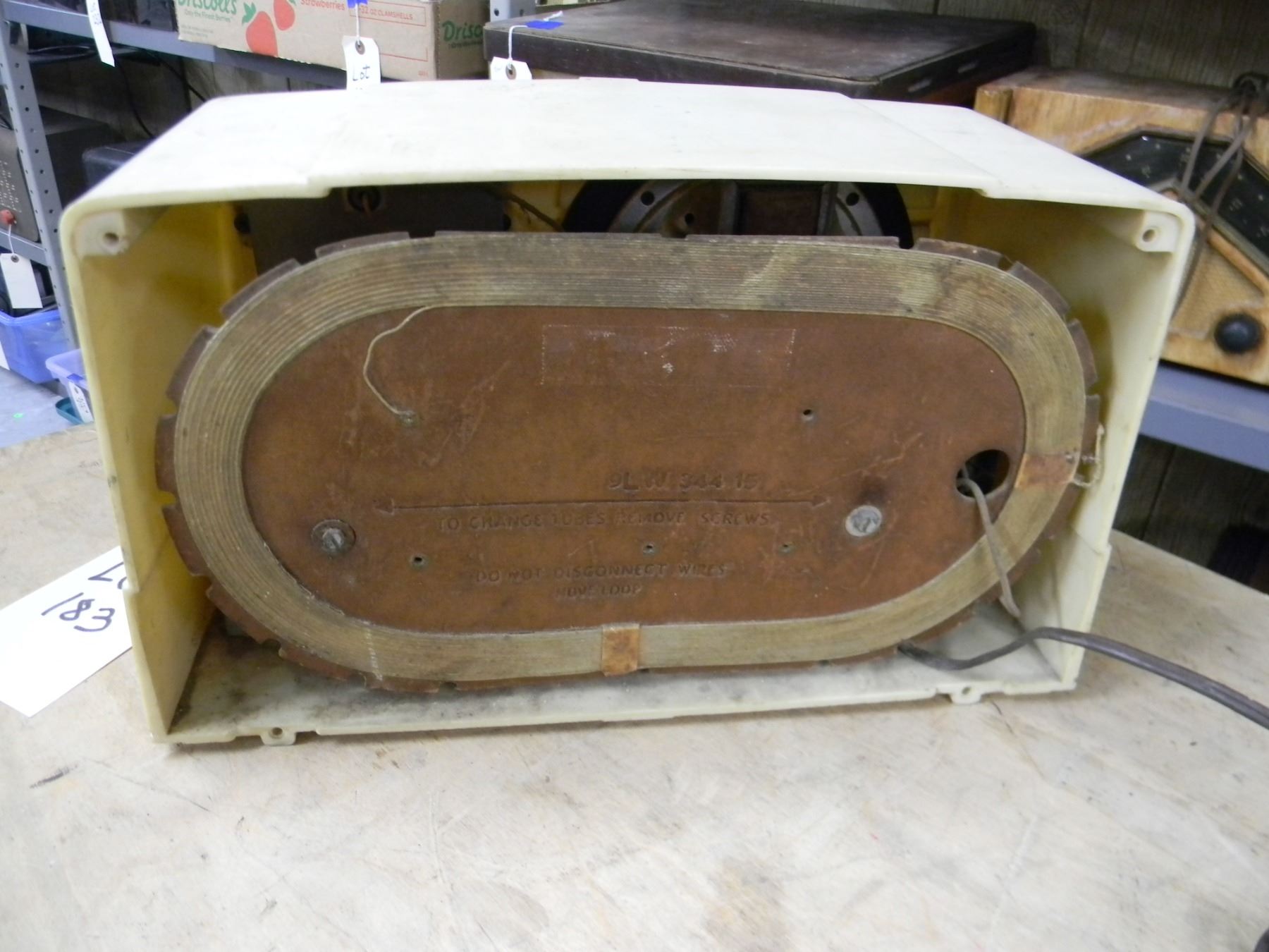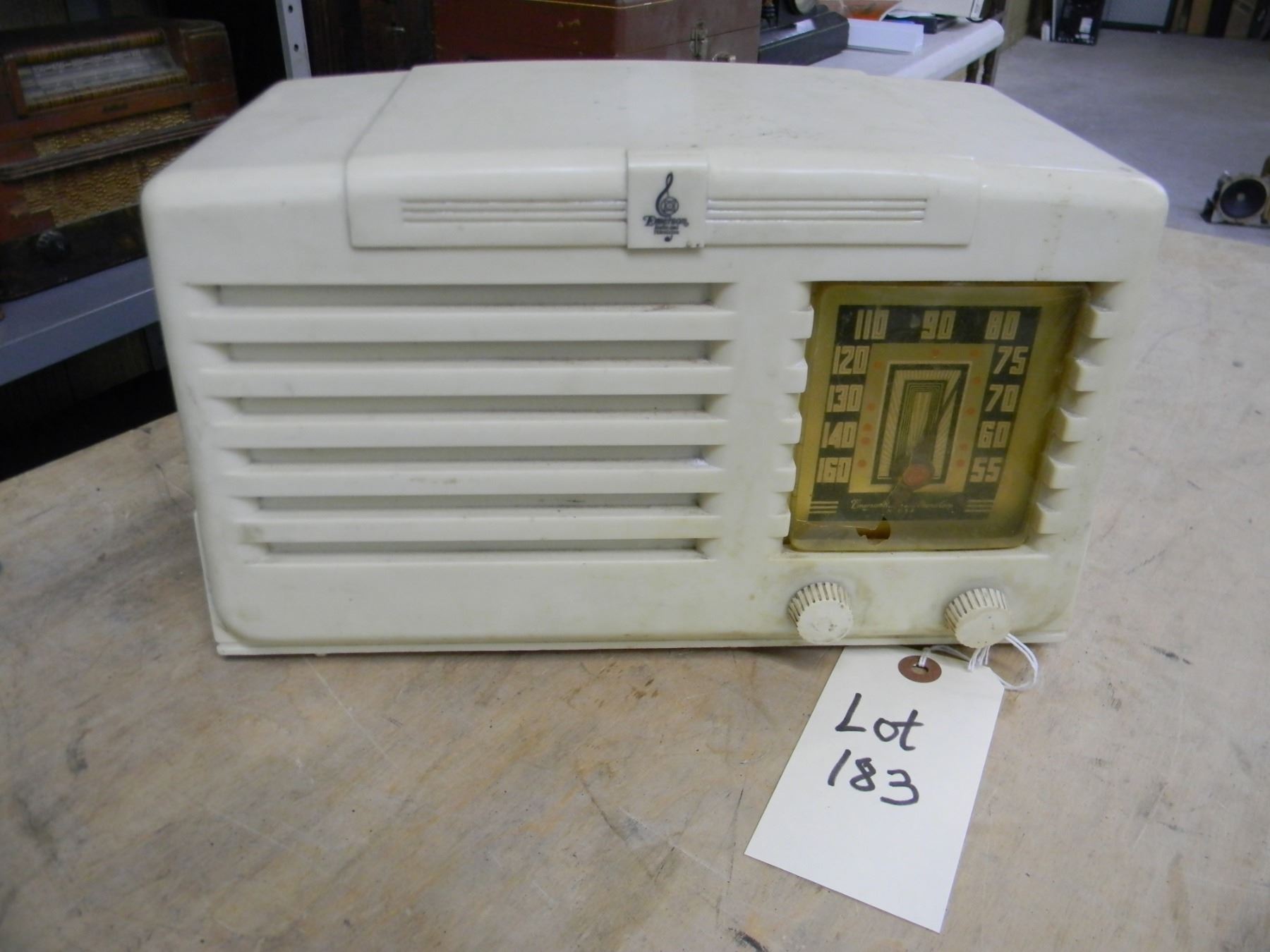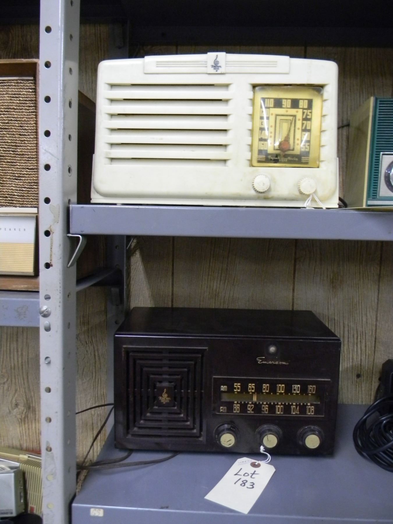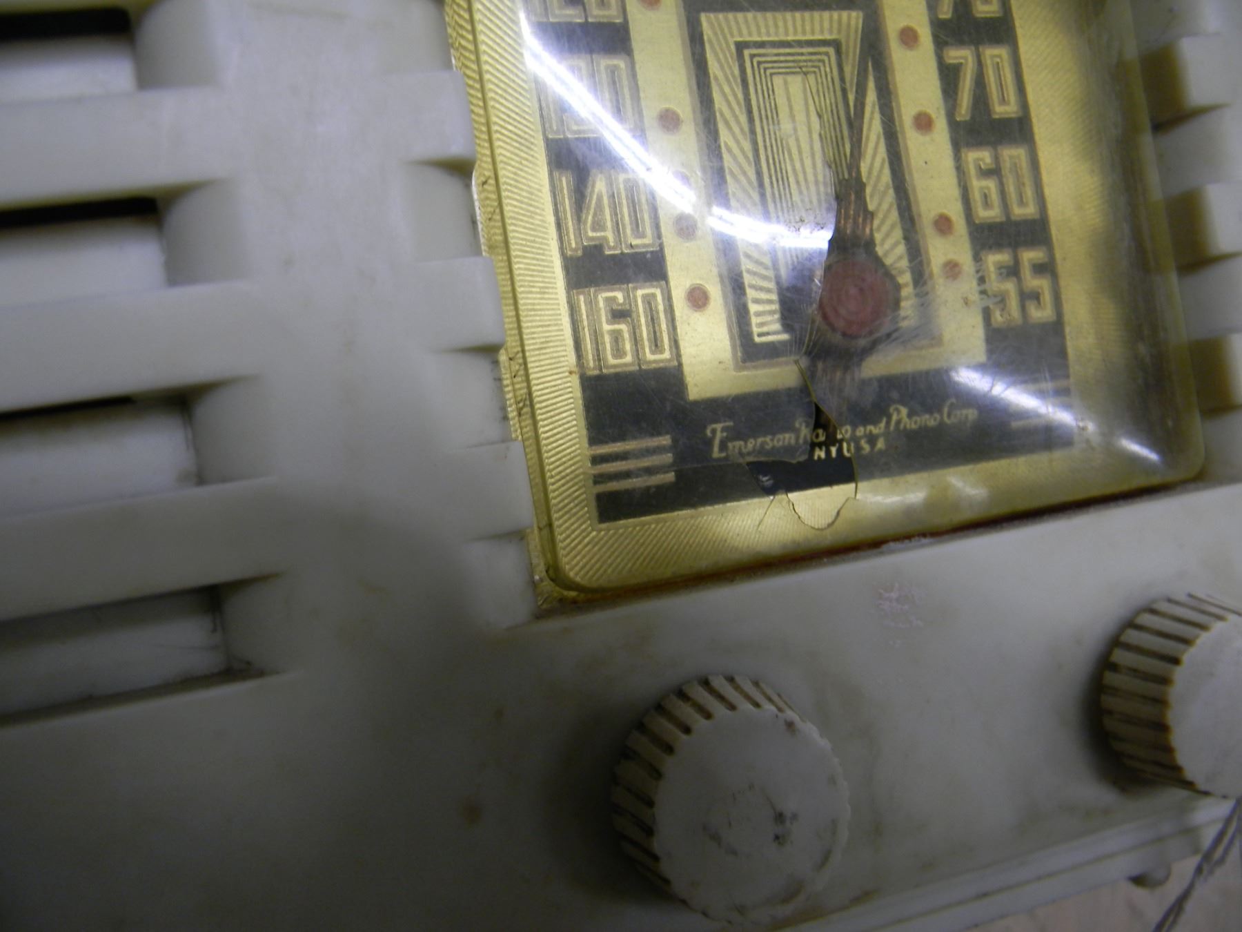 2 radios - Emerson white bakelite table set; no cracks in set; break in dial cover; Emerson bakelite table set - works - crack on one side